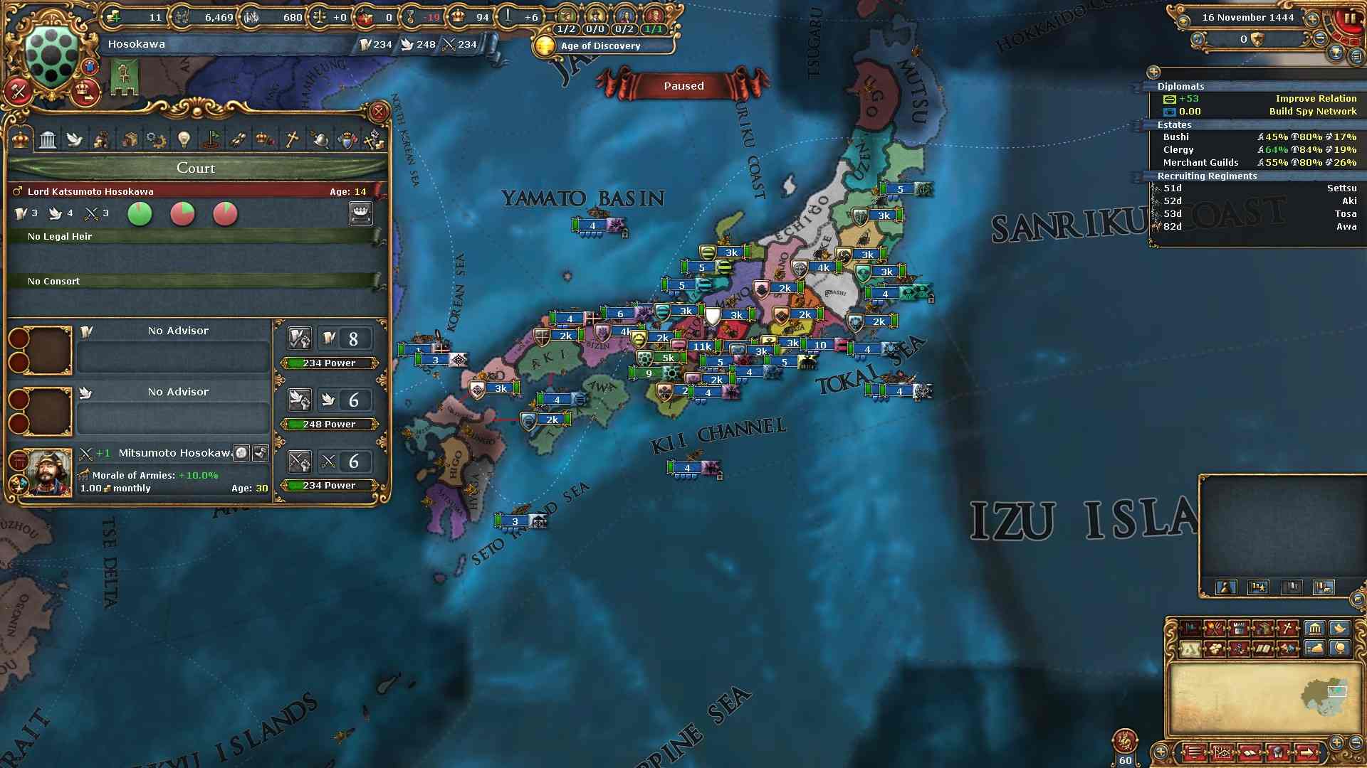 君主点を貯めて首都の摂津を開発しました。