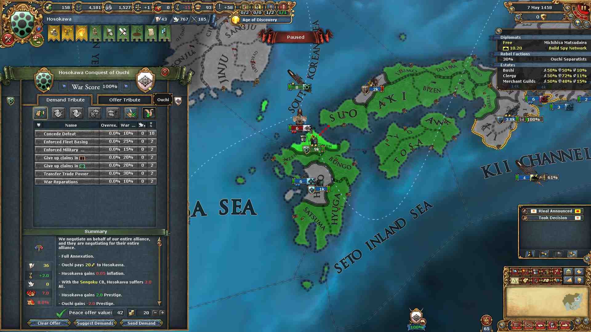 この時期の戦争では、個別和平での割譲や最初の山名戦以外はクレームのない州の割譲は行いません。