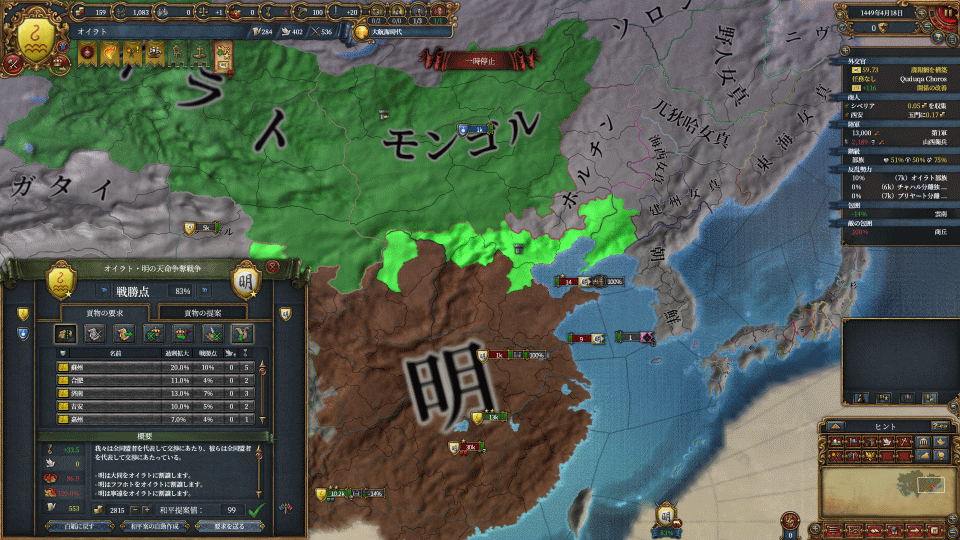 天命0効果と明軍の少なさで、戦勝点83%でも99点講和が取れました。