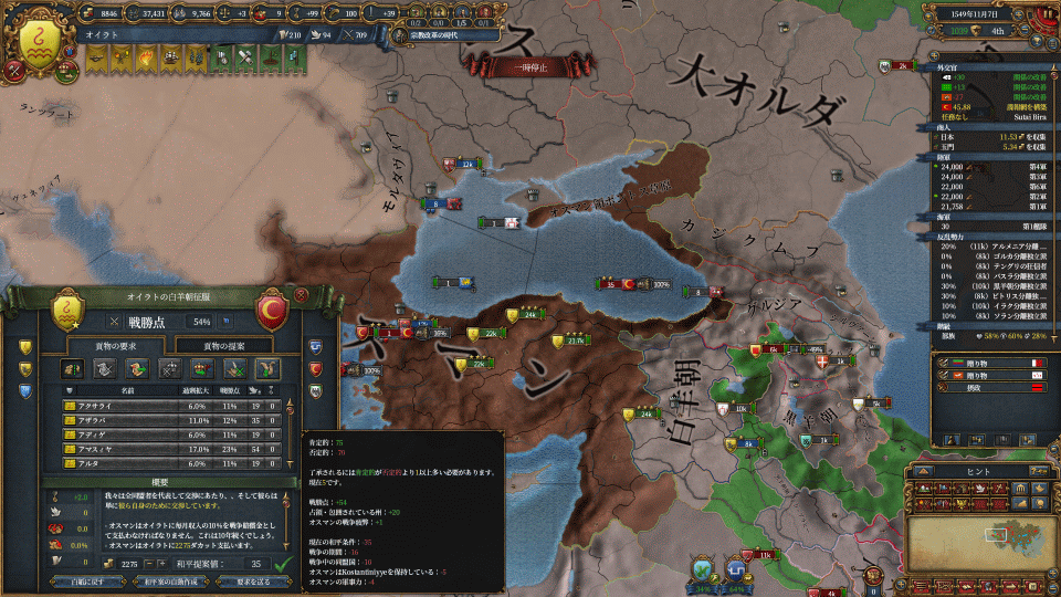 イラン方面を突っ切ってなんとかオスマン同盟国の白羊朝に隣接し、非共戦国でオスマンと戦争開始すると、