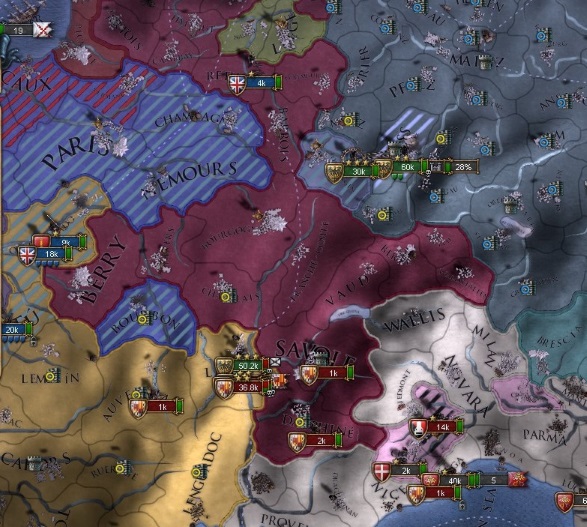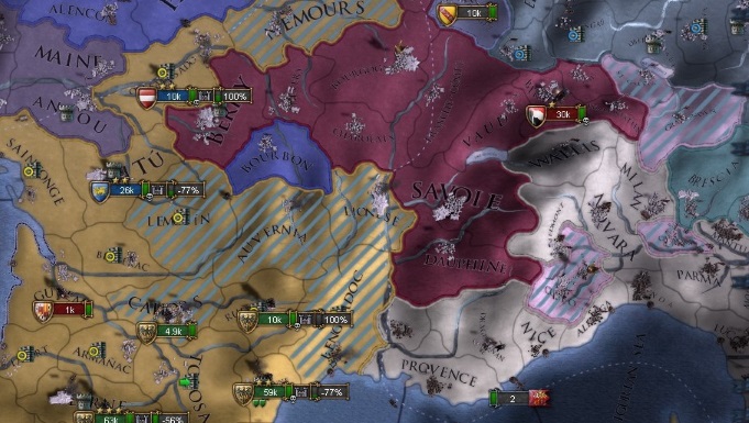 マインツ戦の最中にサヴォイが教皇領とブルゴーニュにぶん殴られて瀕死になっていました。