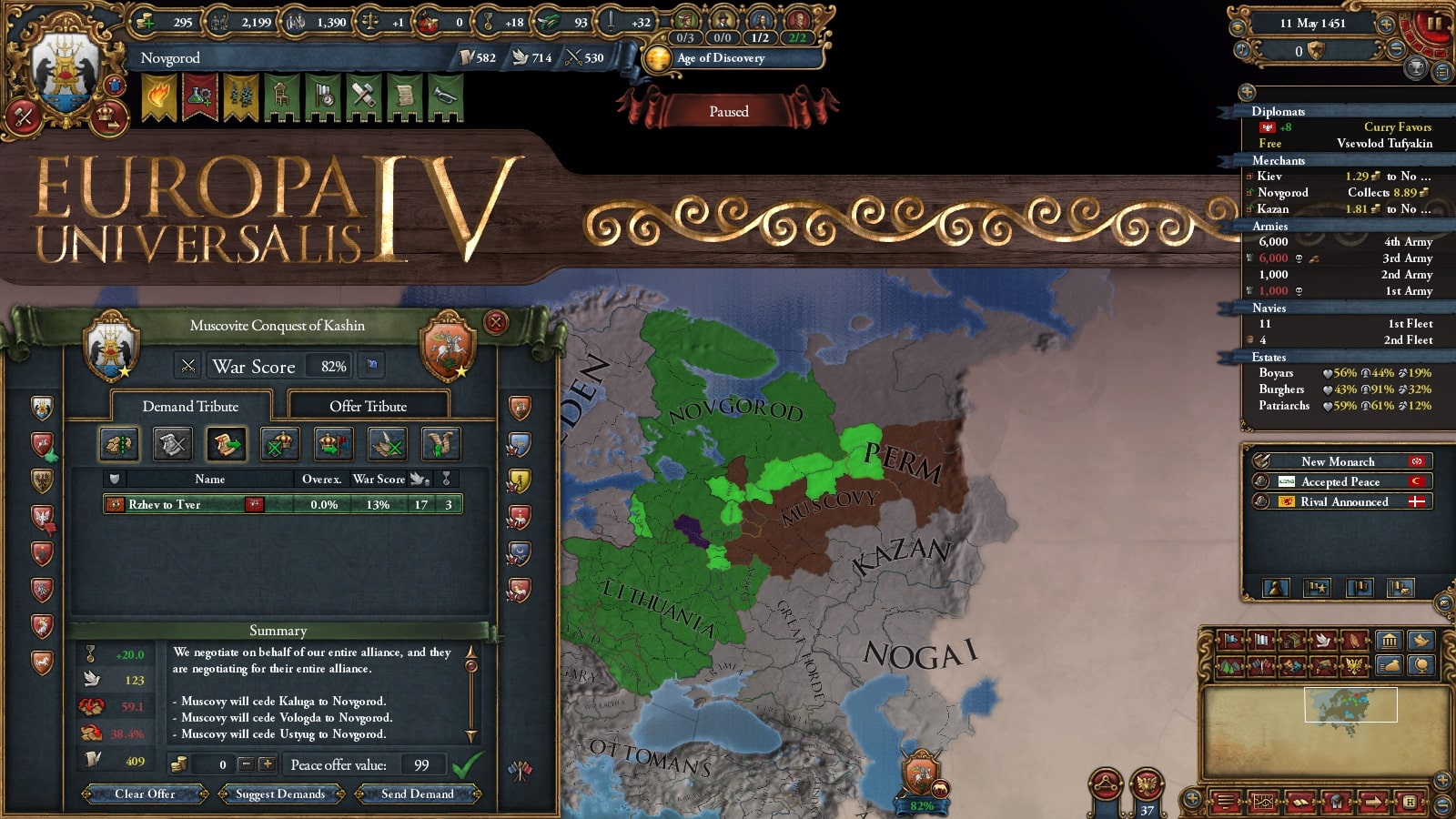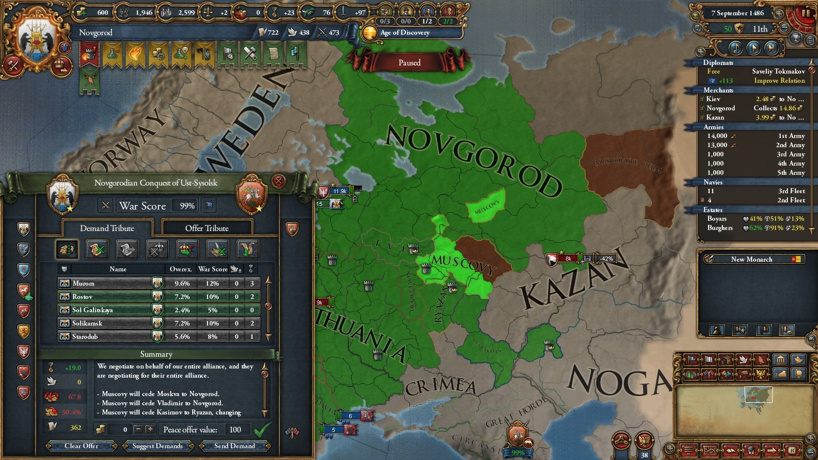ついにモスクワは完全併合。強大なライバル国家であるモスクワも初戦のための準備さえしっかりできれば楽な相手です。