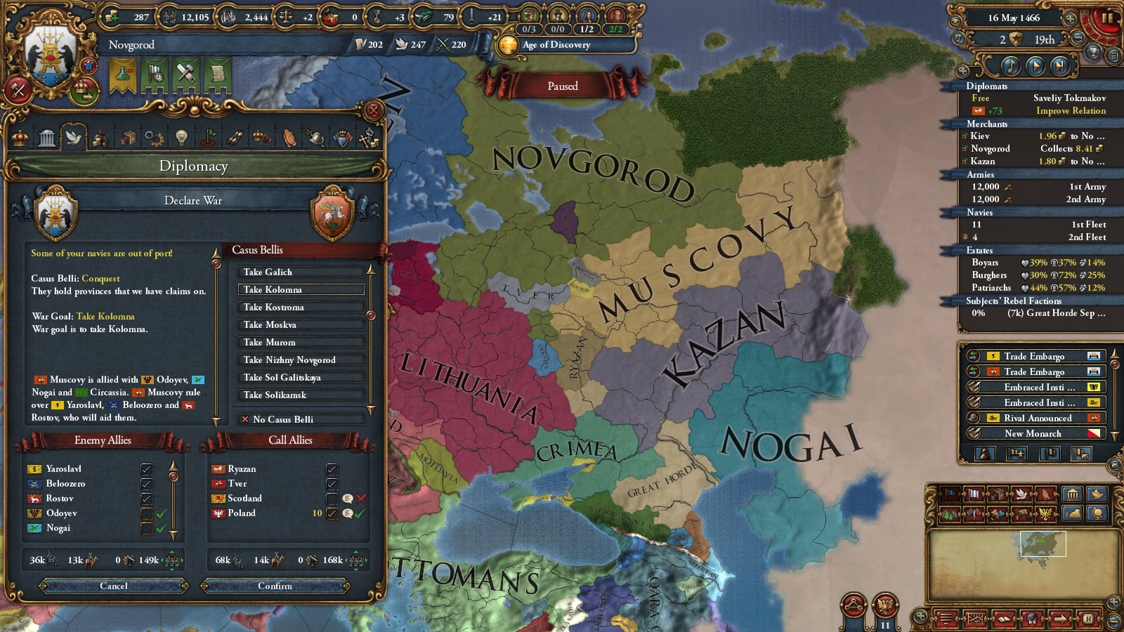 1466年、モスクワとの停戦が切れたので再びポーランドを連れて宣戦します。モスクワはノガイ・オルダ/Nogaiと同盟を結んでいるため、100点を求めるのは厳しそうです。