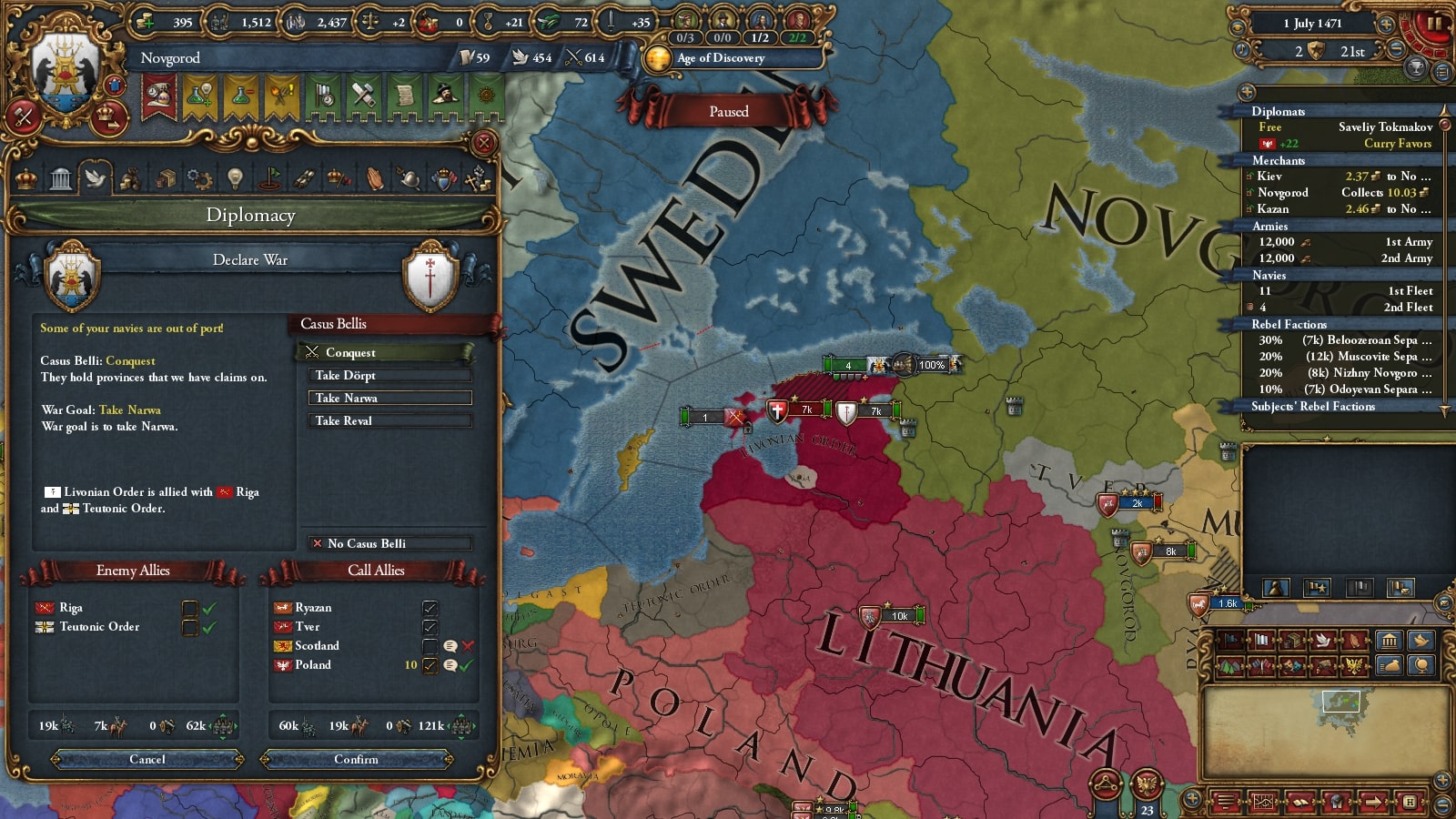 PLCのTrustを上げていたところリヴォニア騎士団戦に来てくれるようなのでリヴォニア騎士団に階級議会でもらった請求権で宣戦、ついでにリガの確保も狙っていきます。
