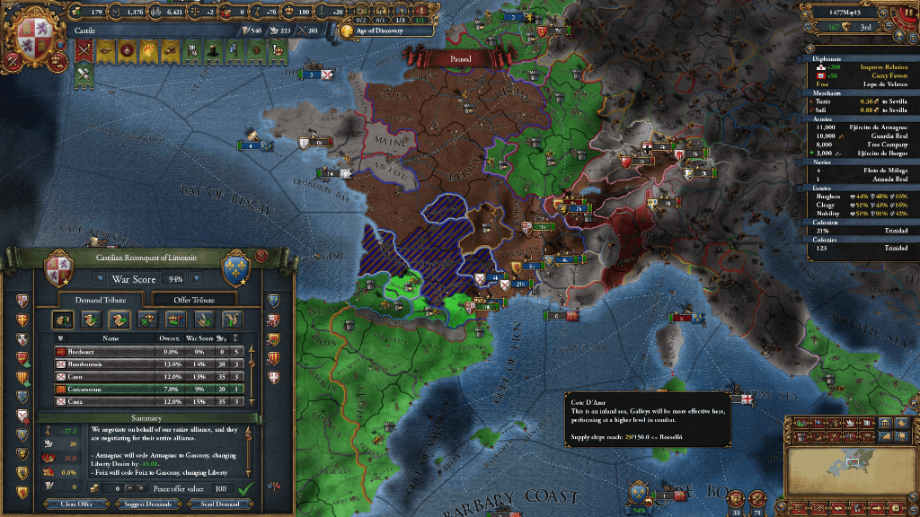 ガスコーニュの再征服コアをがっつりと奪いました。「州の返還」タブからは敵首都の割譲は行えませんが、占領権をガスコーニュに渡して無理矢理割譲させています。