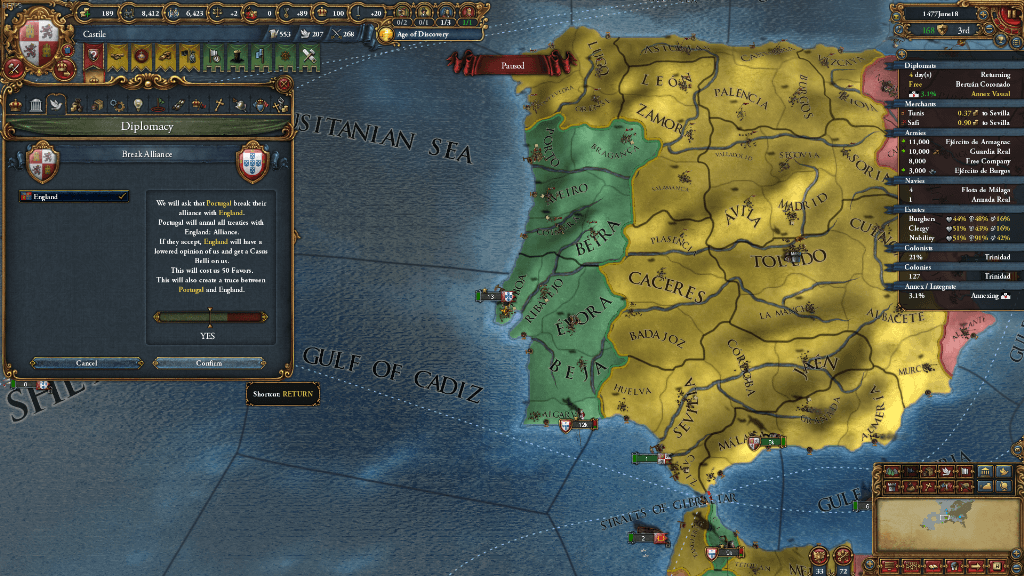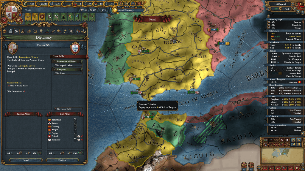 そしてポルトガルとの同盟破棄から5年後、ポルトガルへ「同君連合化」CBを用いて宣戦布告しました(軍事通行権を破棄してから宣戦しました)。