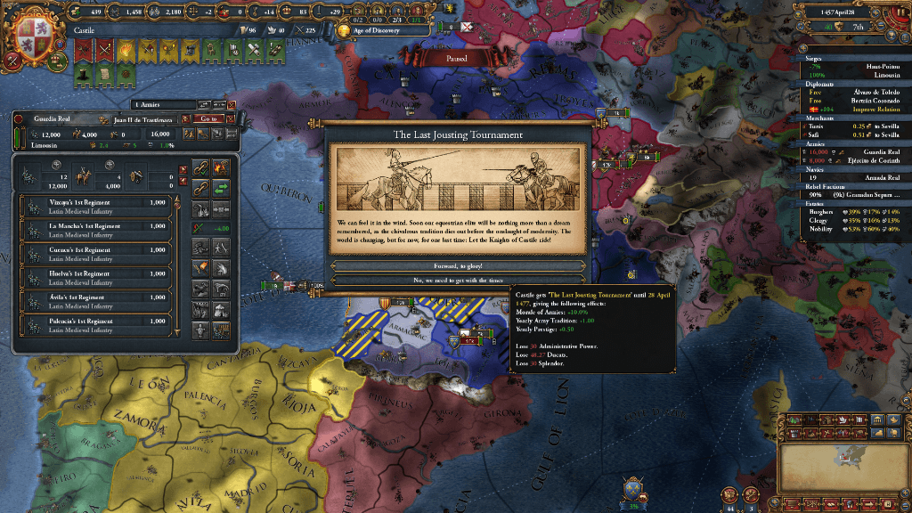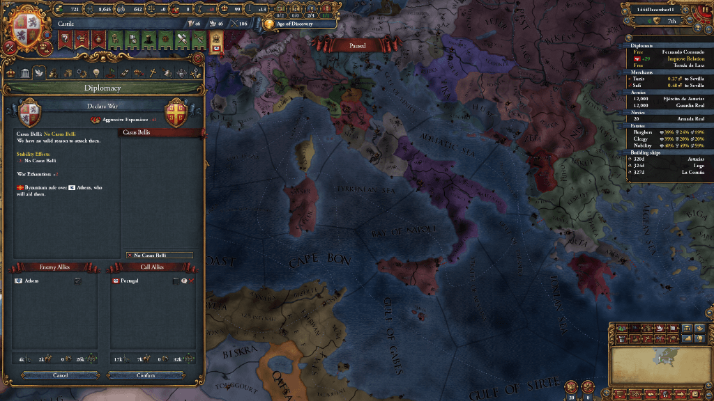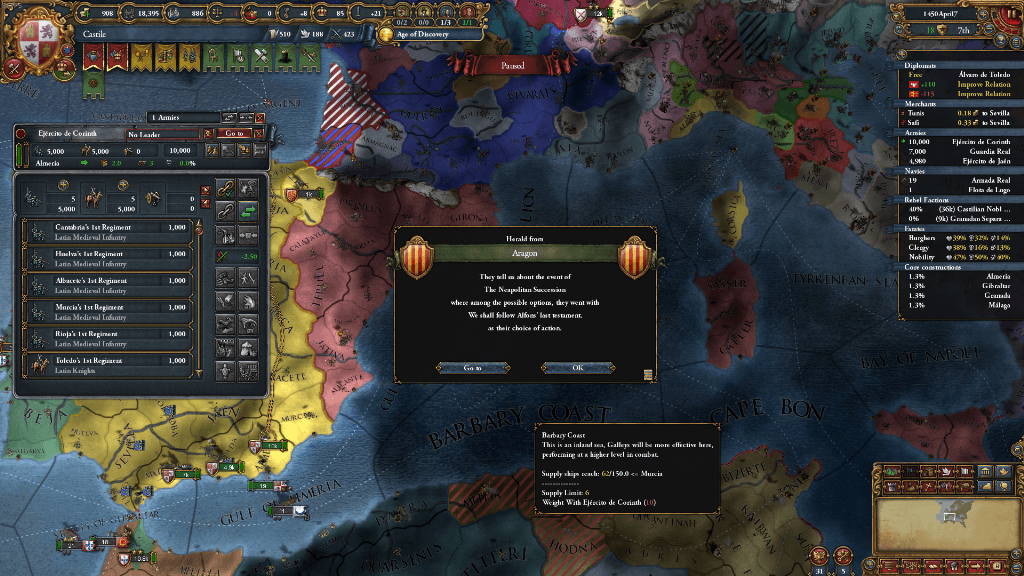 アラゴンがなんかずっと戦ってるなと思い確認したら、ナポリに連合の回復CBを使って戦っていました。トレムセンから領土を奪うに飽き足らず、なかなかの暴れっぷりを見せてくれています。戦後、ナポリはアラゴンの同君下に再度収まっていました。これはカスティーリャにとってありがたすぎる展開です。