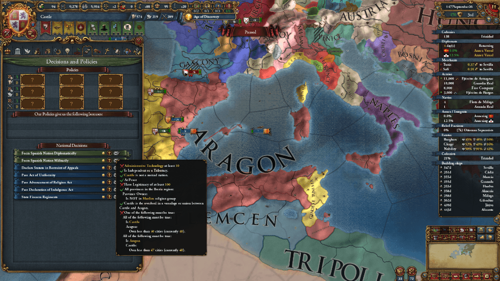 モロッコやらトレムセンの領土をアラゴンに渡し続けていたら、ディシジョンによるスペイン変態条件の「アラゴンの州が40未満」に引っかかっちゃいました。やっちゃった。