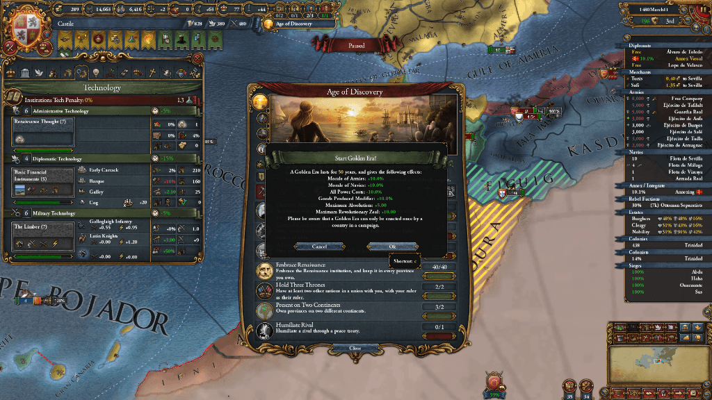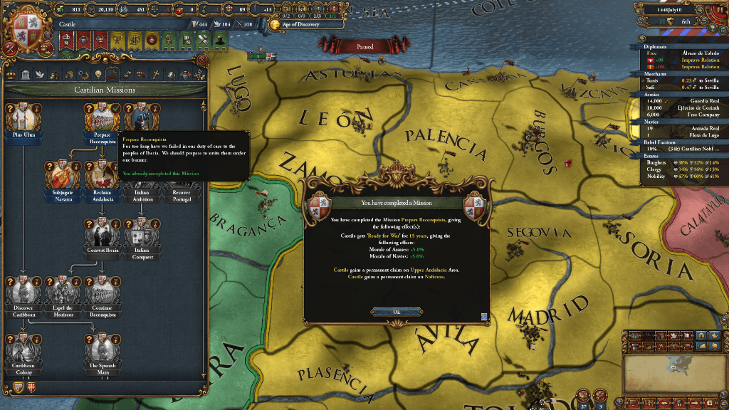 さぁ!最初の準備が完了したら早速やっていきましょう。まずは宿願であるレコンキスタを達成する為にグラナダを攻めたいところですが、ミッションを解放することでグラナダ全域の請求権がもらえます。