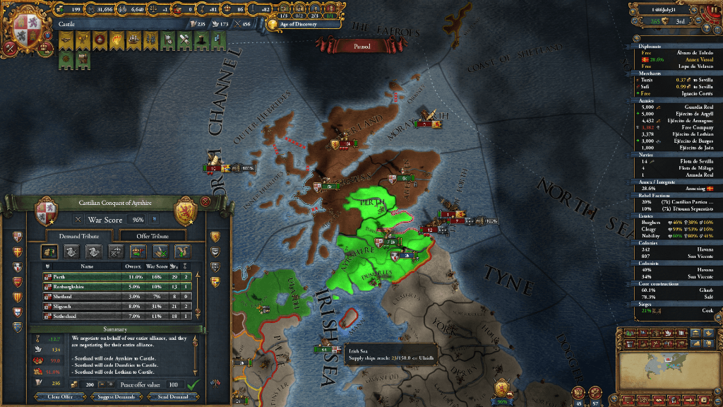 イングランドの拡大を防ぐため、先にスコットランドに宣戦しイングランドをふさぐように割譲しました。割譲した州は全てティローンに統治させます。