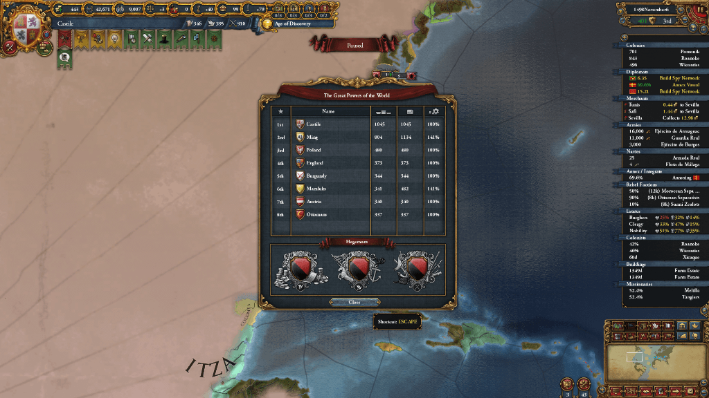 ポルトガルは立地上同盟が結びづらいので、生命線であるイングランドとの同盟も好感度アクションで切ってしまうと5年経っても丸裸のままでした。さくっと同君下位に収めました。
