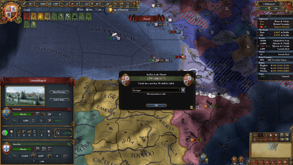 0/0/0の19歳後継者エンリケを廃嫡しました。いきなり王朝断絶の危機ですが、0/0/0はちょっとねぇ…。