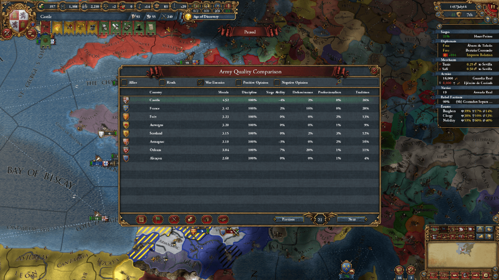 カスティーリャの軍質です。フランスの士気を大幅に上回っております。楽しくなって沢山戦闘したら人的が尽きました。やっちまった…