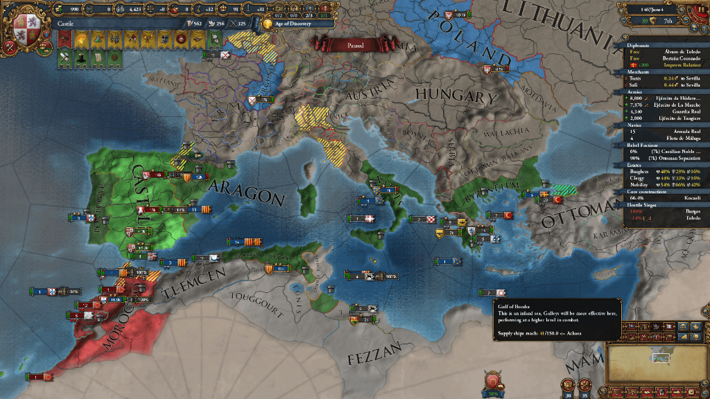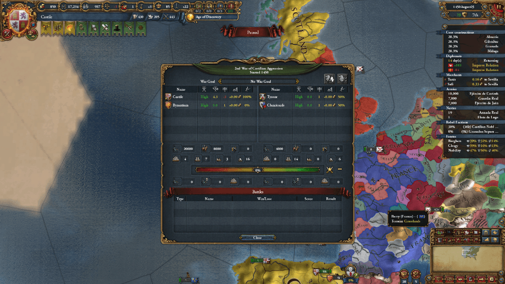 アラゴンがなんかずっと戦ってるなと思い確認したら、ナポリに連合の回復CBを使って戦っていました。トレムセンから領土を奪うに飽き足らず、なかなかの暴れっぷりを見せてくれています。戦後、ナポリはアラゴンの同君下に再度収まっていました。これはカスティーリャにとってありがたすぎる展開です。
