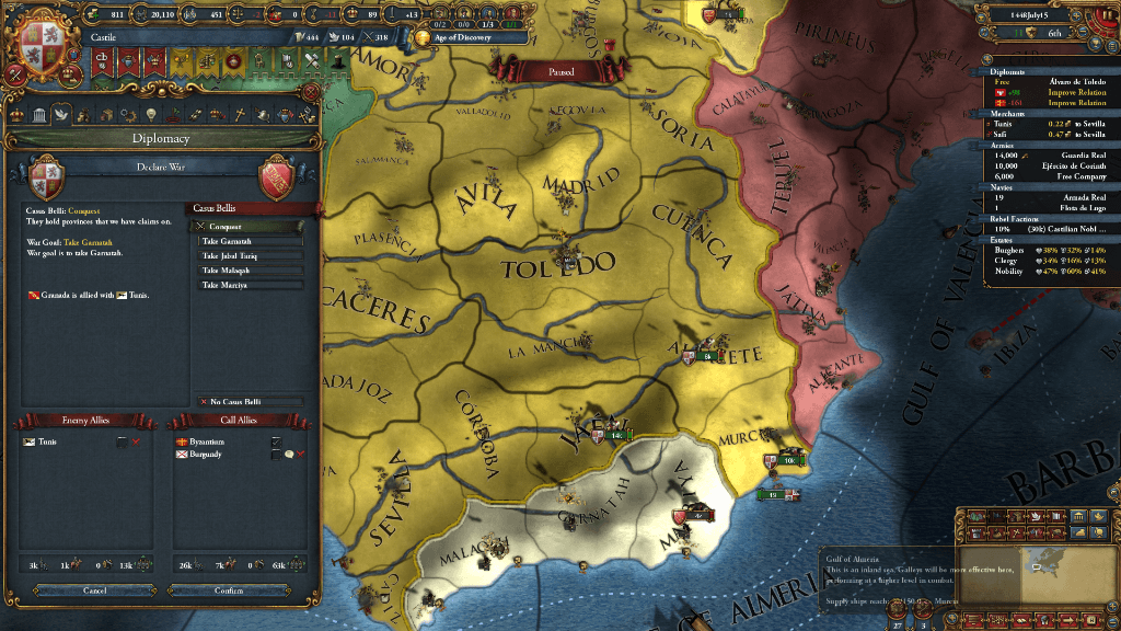 さぁ!最初の準備が完了したら早速やっていきましょう。まずは宿願であるレコンキスタを達成する為にグラナダを攻めたいところですが、ミッションを解放することでグラナダ全域の請求権がもらえます。
