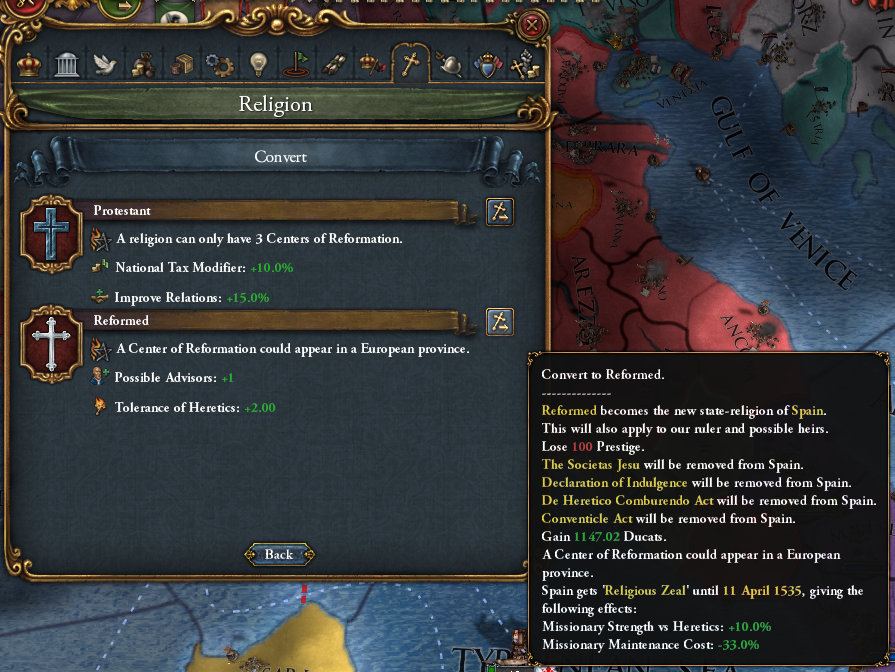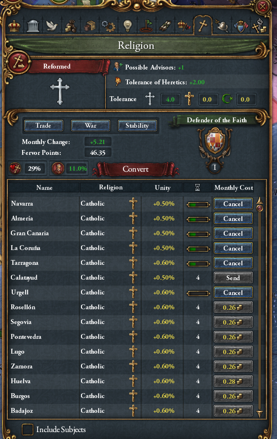 改宗後、市民階級特権の「異端寛容度+2」を取っています。改革派の特徴である「異端寛容度+2」と、100の正当性により、合計の異端寛容度が+3になっています。不寛容によるプロビ出力が落ちませんので、安心して改宗していきましょう。