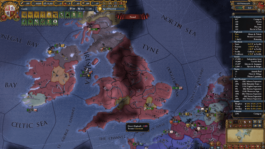 以上の目的でイングランドを攻め、ロンドンおよび交易中心地がある州1つを割譲しました。AEが恐ろしく飛ぶので、2州の割譲で許しています。