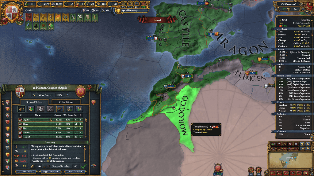 モロッコに宣戦し、全州割譲させました。おかげで、セビリアノードはカスティーリャとポルトガル2国の独占状態です。