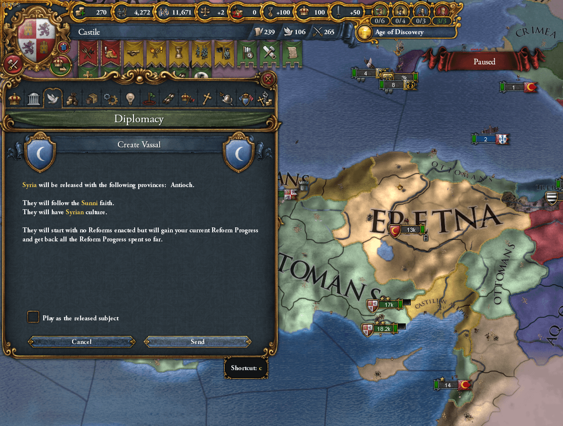 運よくシリアの種地を持っていたため、エレトナのコア+シリア州を割譲し、シリアを属国解放しています。