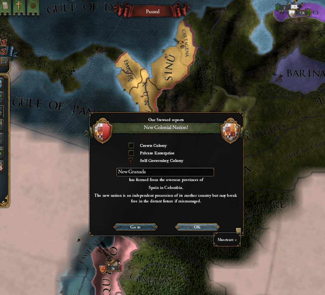 1527年、コロンビアに5か国目の植民地国家が誕生しました。植民地国家が誕生したら、基本的にそのリージョンは植民地国家に任せて次のリージョンに植民地国家を発生させに行きます。