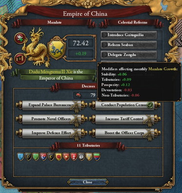 (貢納国との戦争でも土地を要求できますが、明に対しては正当な宣戦にならず、中華の土地は発展度が割と高いこともあり、大して土地を奪えない……はず。