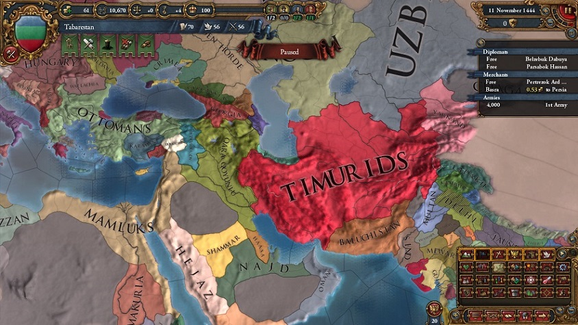 ついにペルシア帝国再建プレイきたー!今までペルシアプレイしたかったけど1444年開始シナリオでペルシアができなかったからね。ver1.8でタバリスタンが追加されて朕は嬉しいよ。