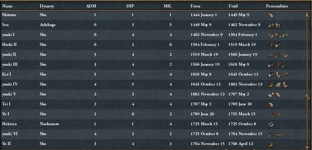 それと最初に出してしまいますが見てくださいこの超有能な君主たちの能力を!これだけの人物たちが出てきてくれれば世界征服もたやすいものです*14