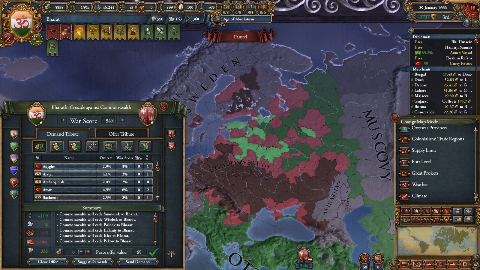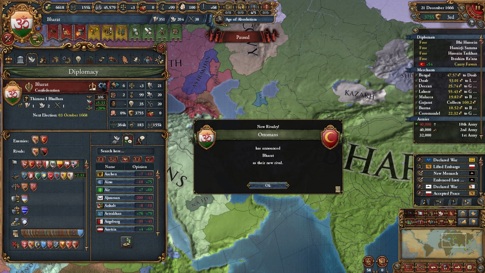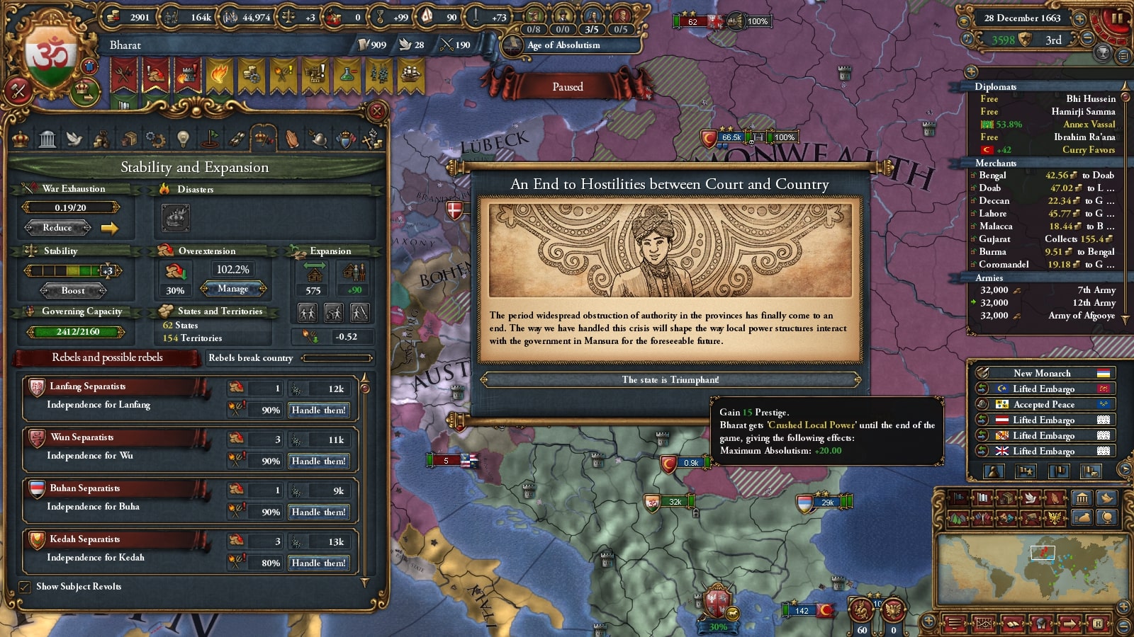 1672年にバーラト・シク連邦の統治者に就いたKrishna I Kohkkarは、長期的な征服を目標とし、しばらく領土拡大を停止し、この国の歳入構造を大きく変える大改革を行いました。国内の過激派貴族はこの決断に対し弱気であると反発しますが、結果的にバーラトは1Mの軍隊を維持できるようになり、のちの統治者や専門家によって隠れた名君と評価されました。