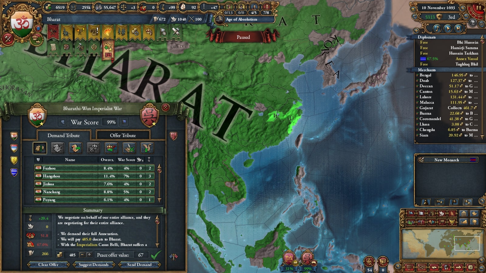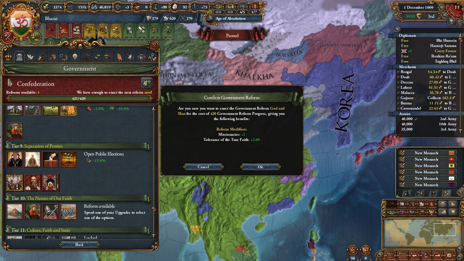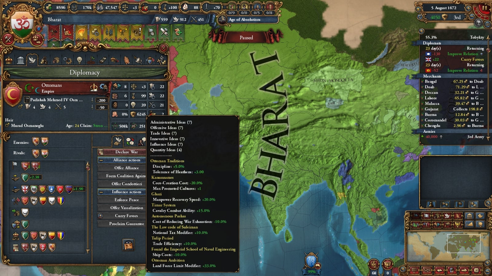 1672年にバーラト・シク連邦の統治者に就いたKrishna I Kohkkarは、長期的な征服を目標とし、しばらく領土拡大を停止し、この国の歳入構造を大きく変える大改革を行いました。国内の過激派貴族はこの決断に対し弱気であると反発しますが、結果的にバーラトは1Mの軍隊を維持できるようになり、のちの統治者や専門家によって隠れた名君と評価されました。