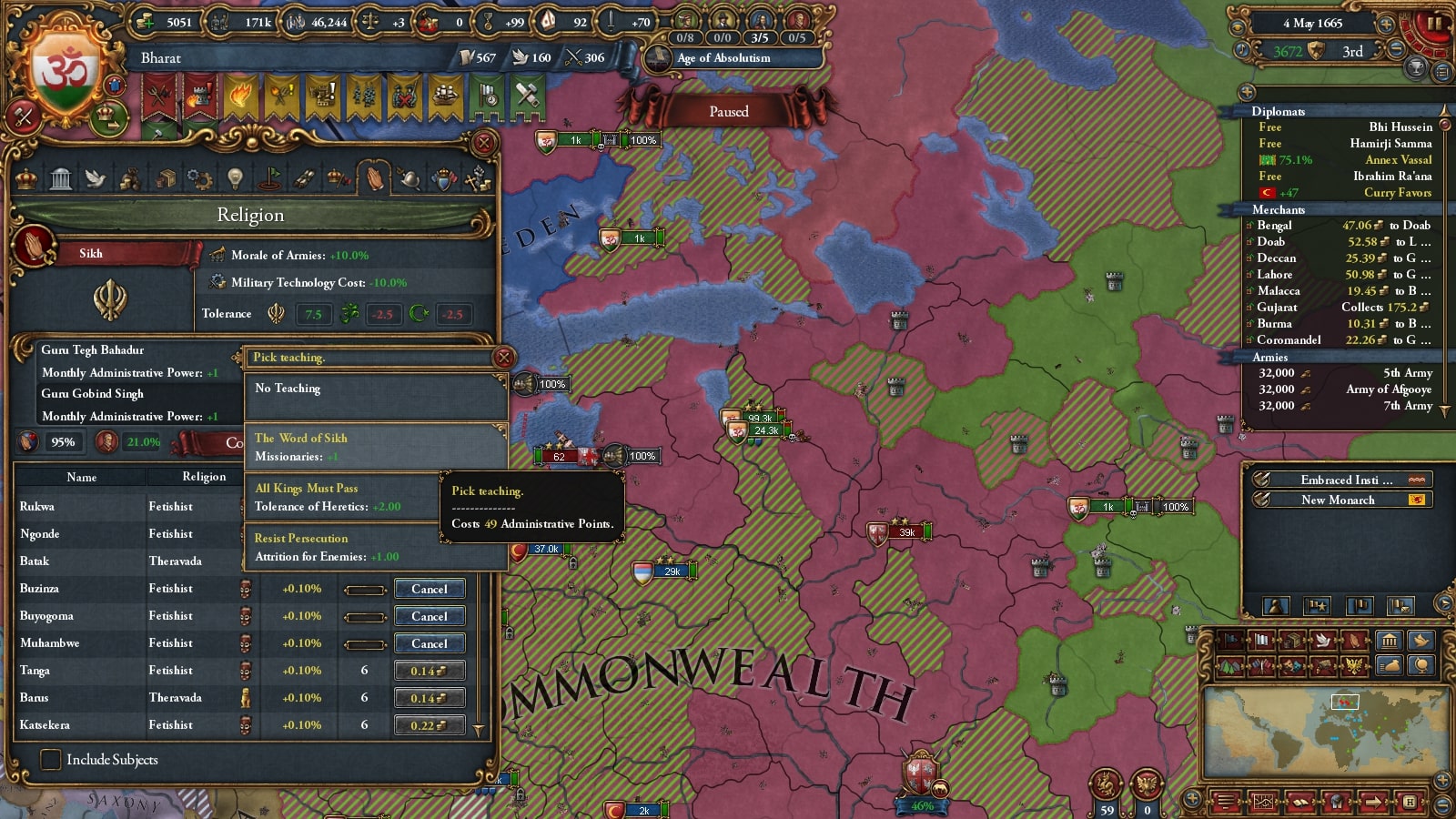 1665年3月を超えテーグ・バハードゥル / Tegh Bahadurの教義を設定できるようになったので、宣教師+1を得られる教義「The Word of Sikh」を設定しました。