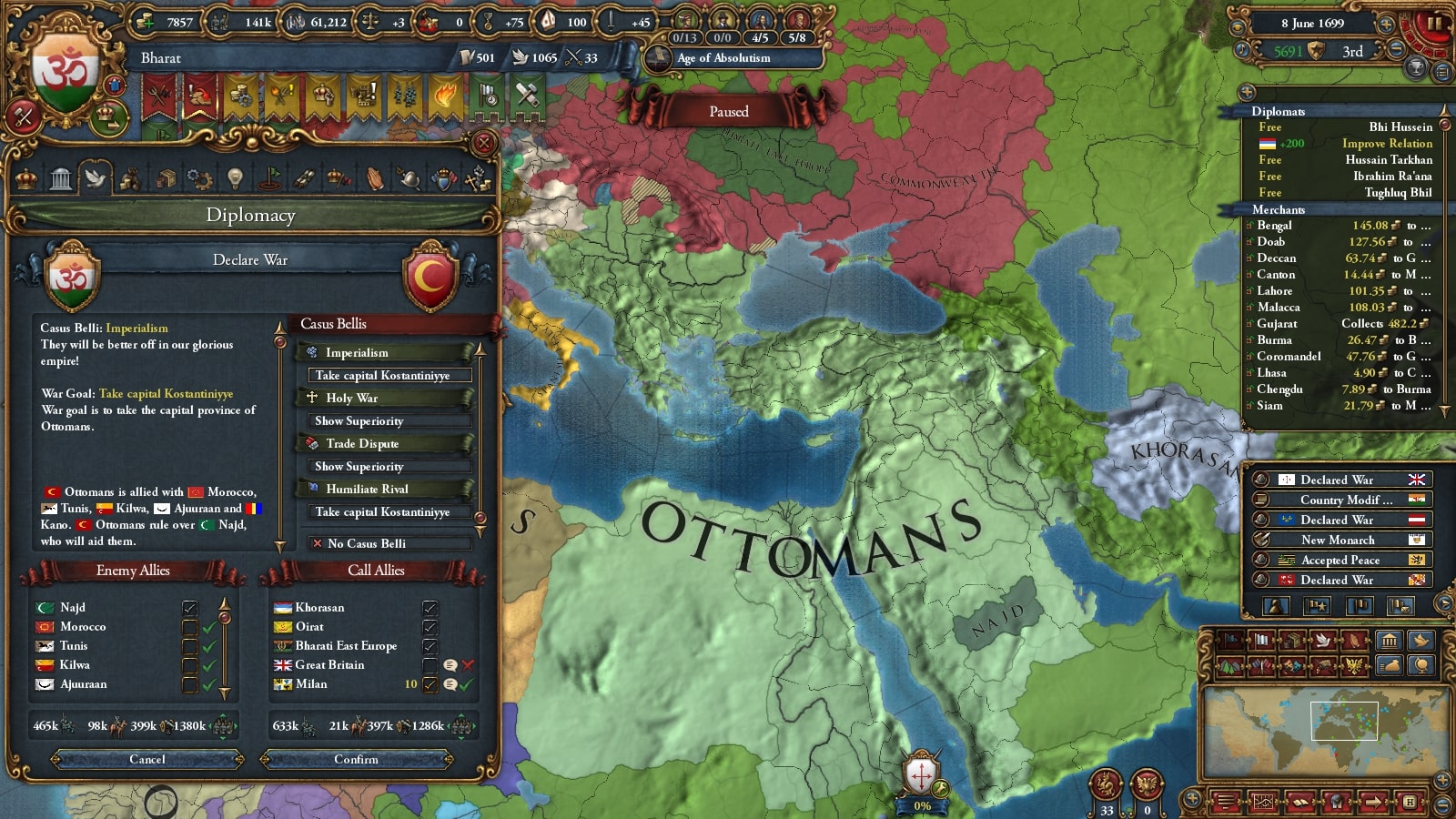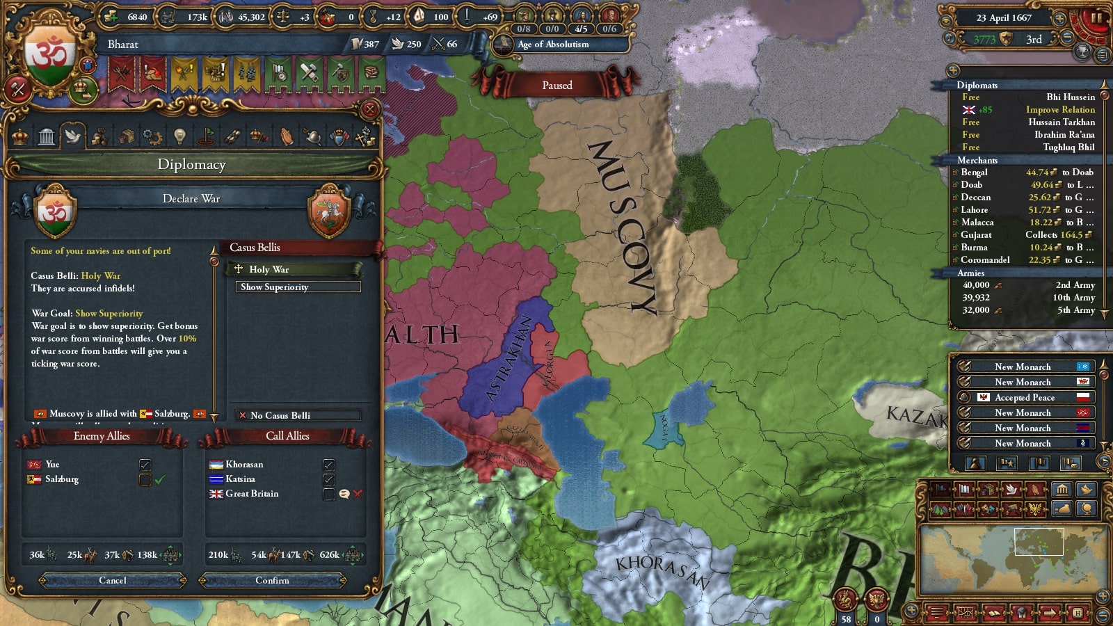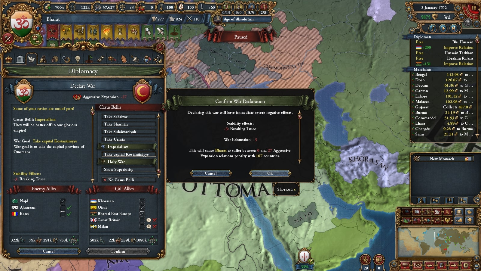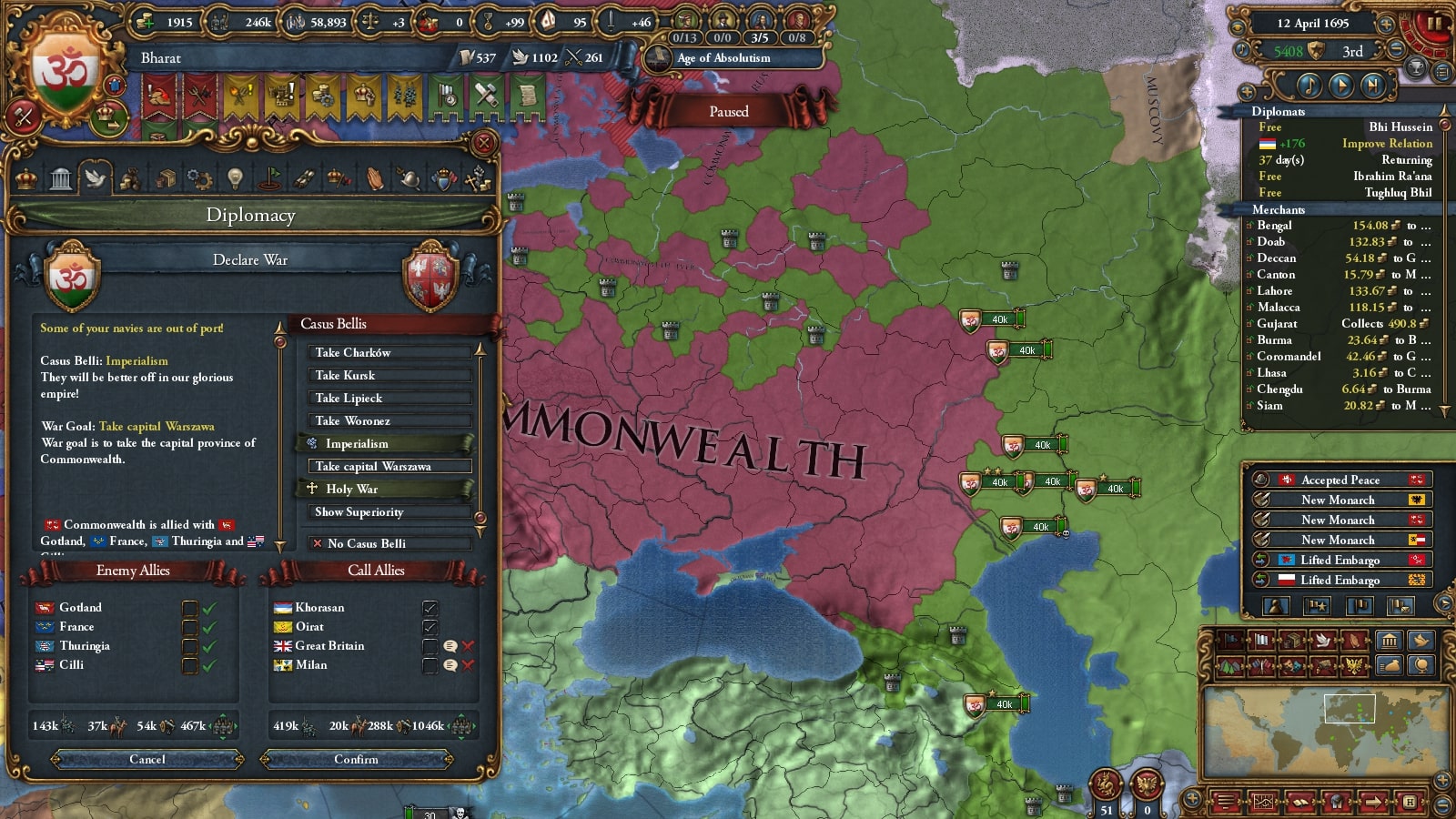 オスマン連れて第二次コモンウェルス戦です。敵同盟国で厄介なのは50k出してくるアウクスブルク/Augsburgくらい、余裕でしょう。