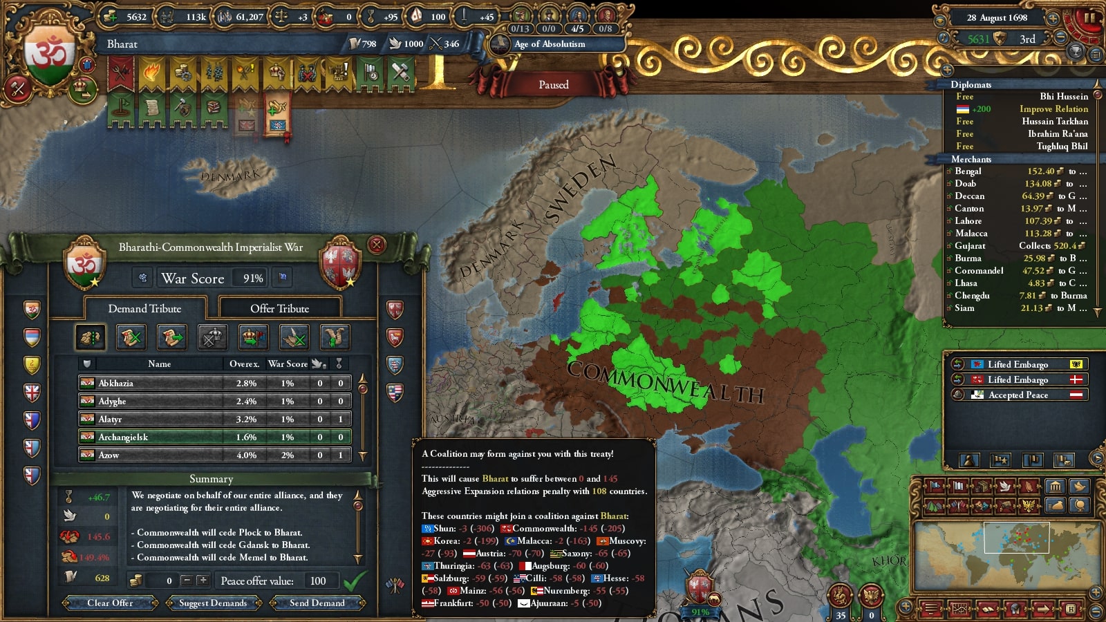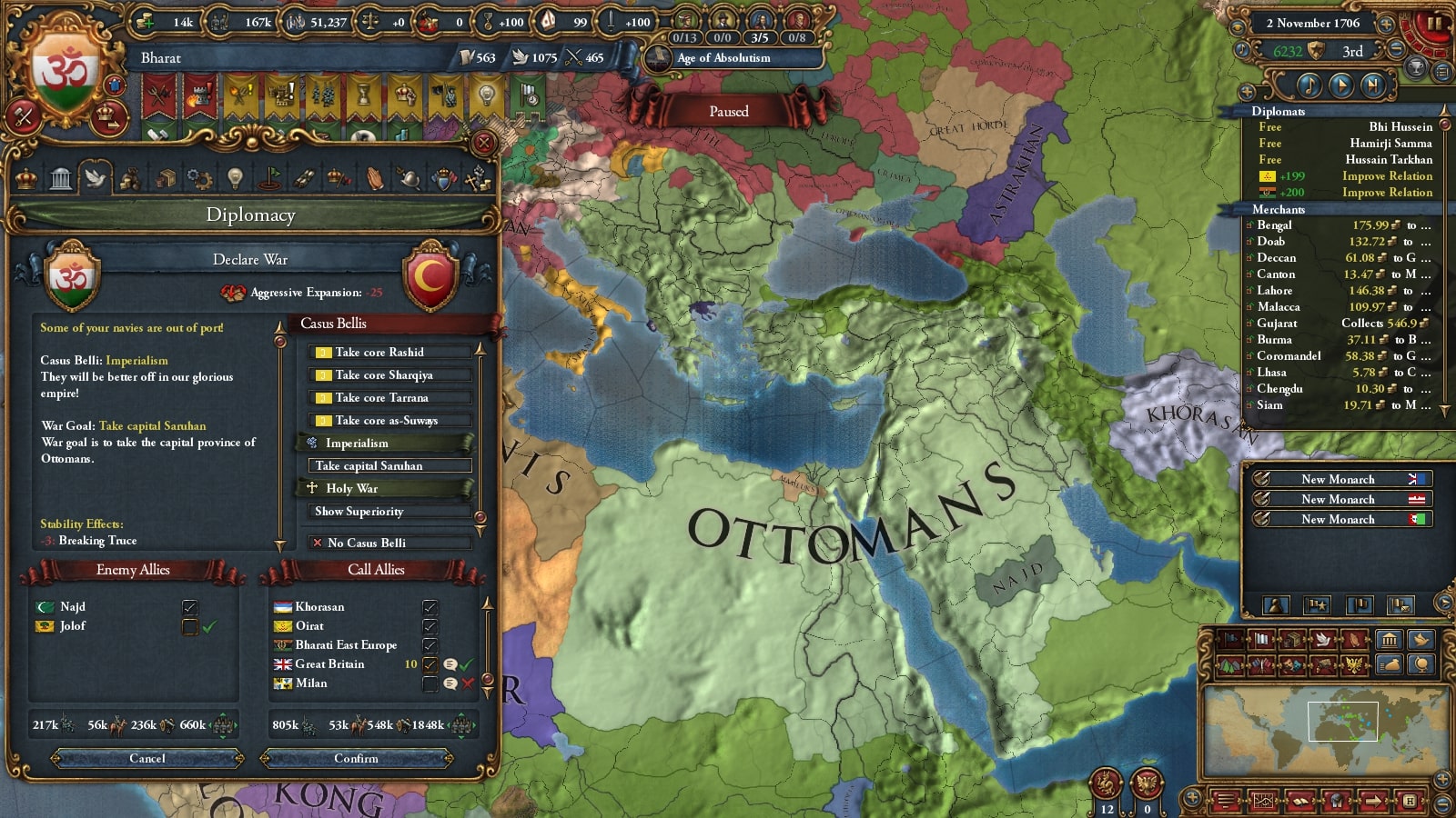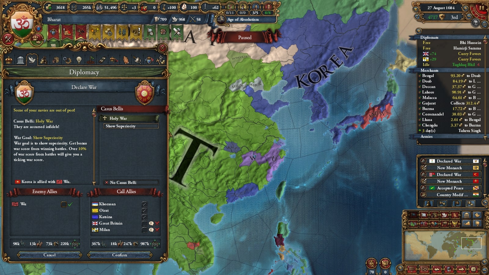 オスマン連れて第二次コモンウェルス戦です。敵同盟国で厄介なのは50k出してくるアウクスブルク/Augsburgくらい、余裕でしょう。