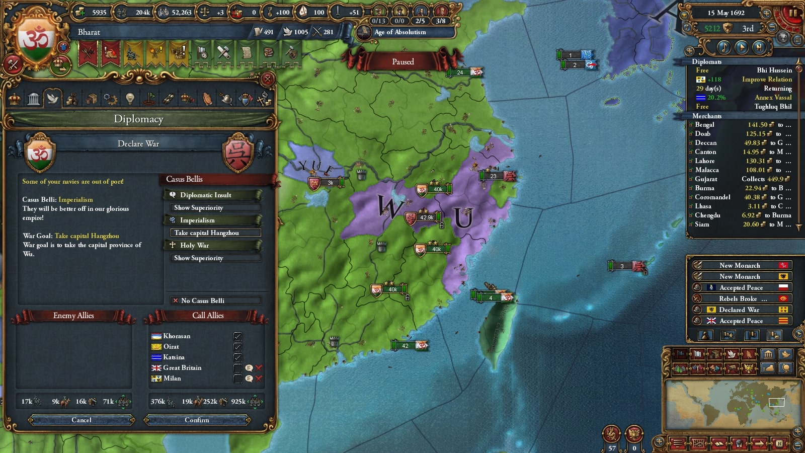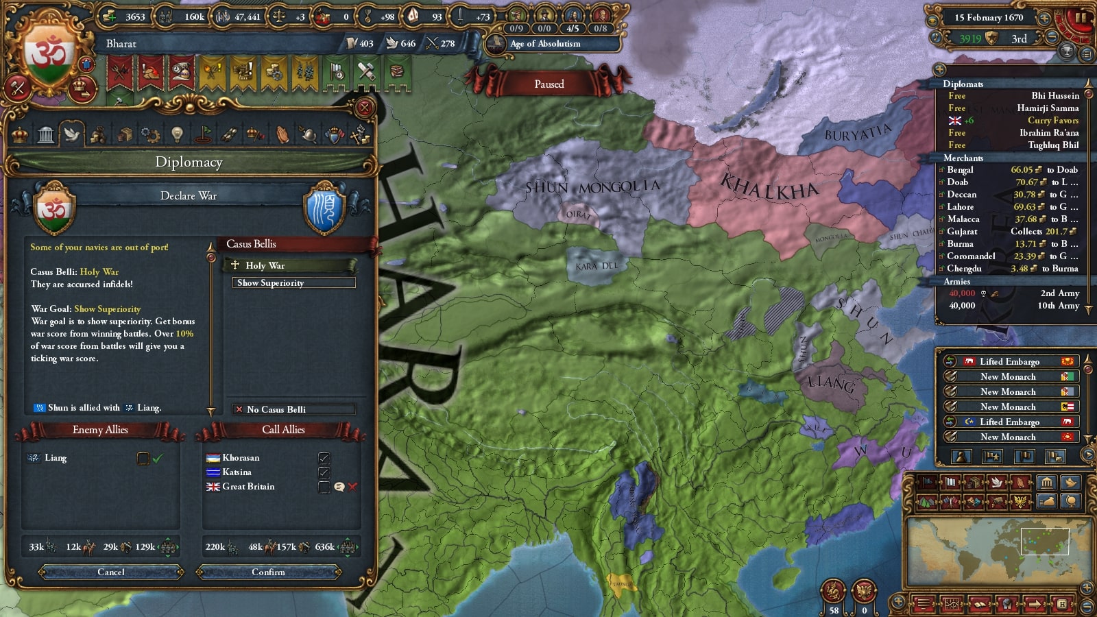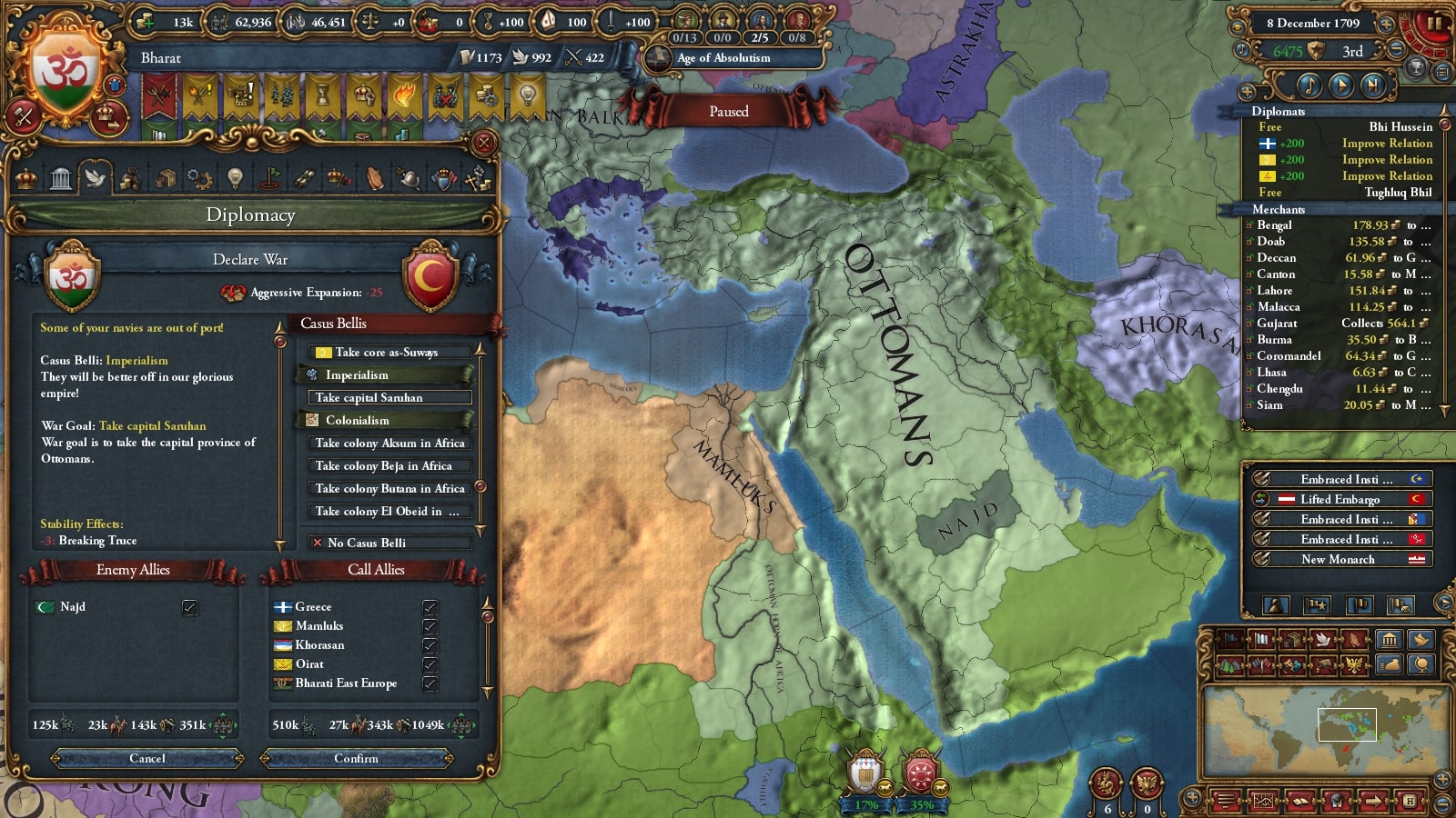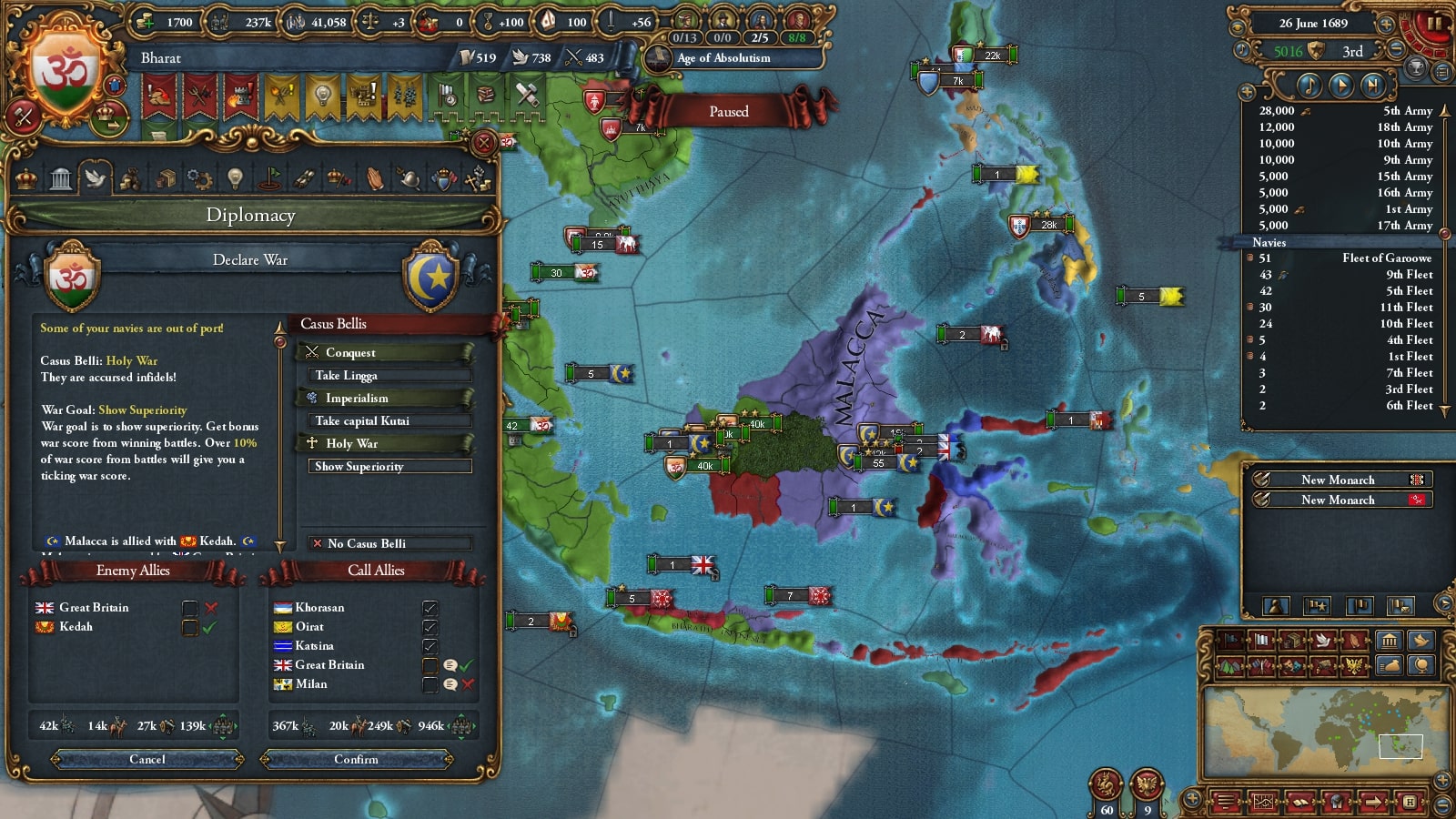 オスマン連れて第二次コモンウェルス戦です。敵同盟国で厄介なのは50k出してくるアウクスブルク/Augsburgくらい、余裕でしょう。
