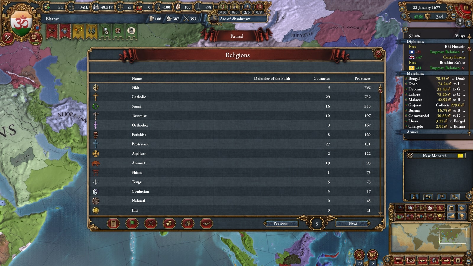 神権制Tier10制定で宣教師が+1され、総宣教師数が8人に。最大値に到達しました。引き続き改宗させていきましょう。