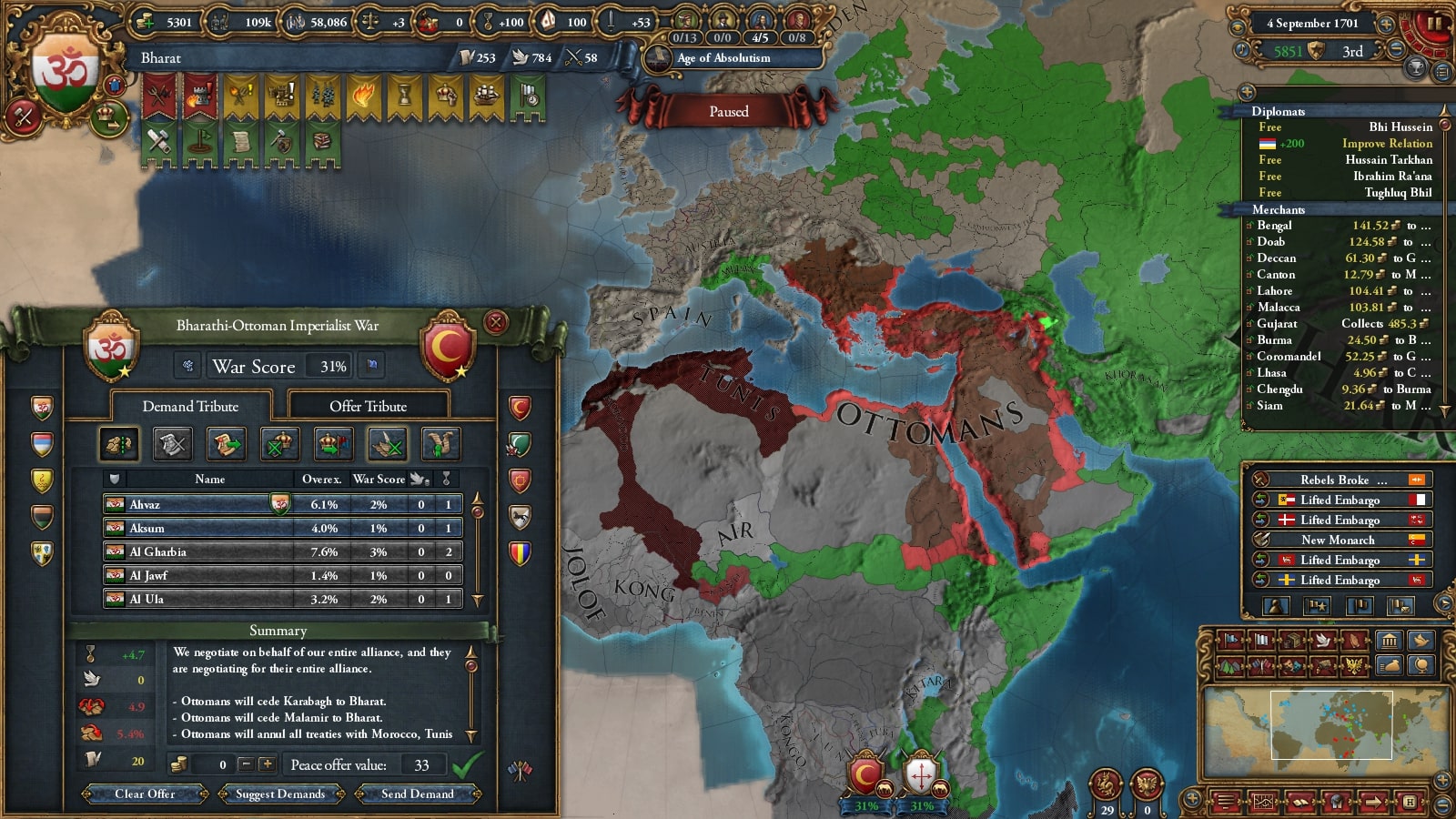 列強の他メンバーはトップだったオスマンを抑えたことで他は制御可能ですかね。神権パワーを信じましょう。
