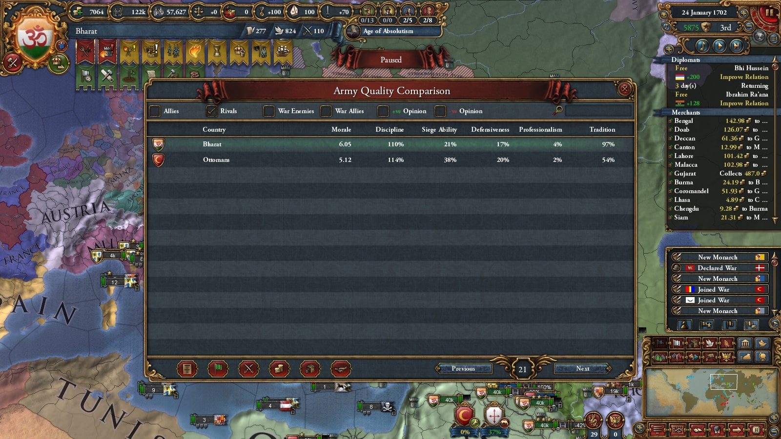 あーーーーーーーー、恐れていた事態が起きた。オスマンが軍量アイデアを取得しています。これでこのまま放置するとオスマンの総軍量が1Mを超えることが確定、軍事覇権をとられてしまいます。