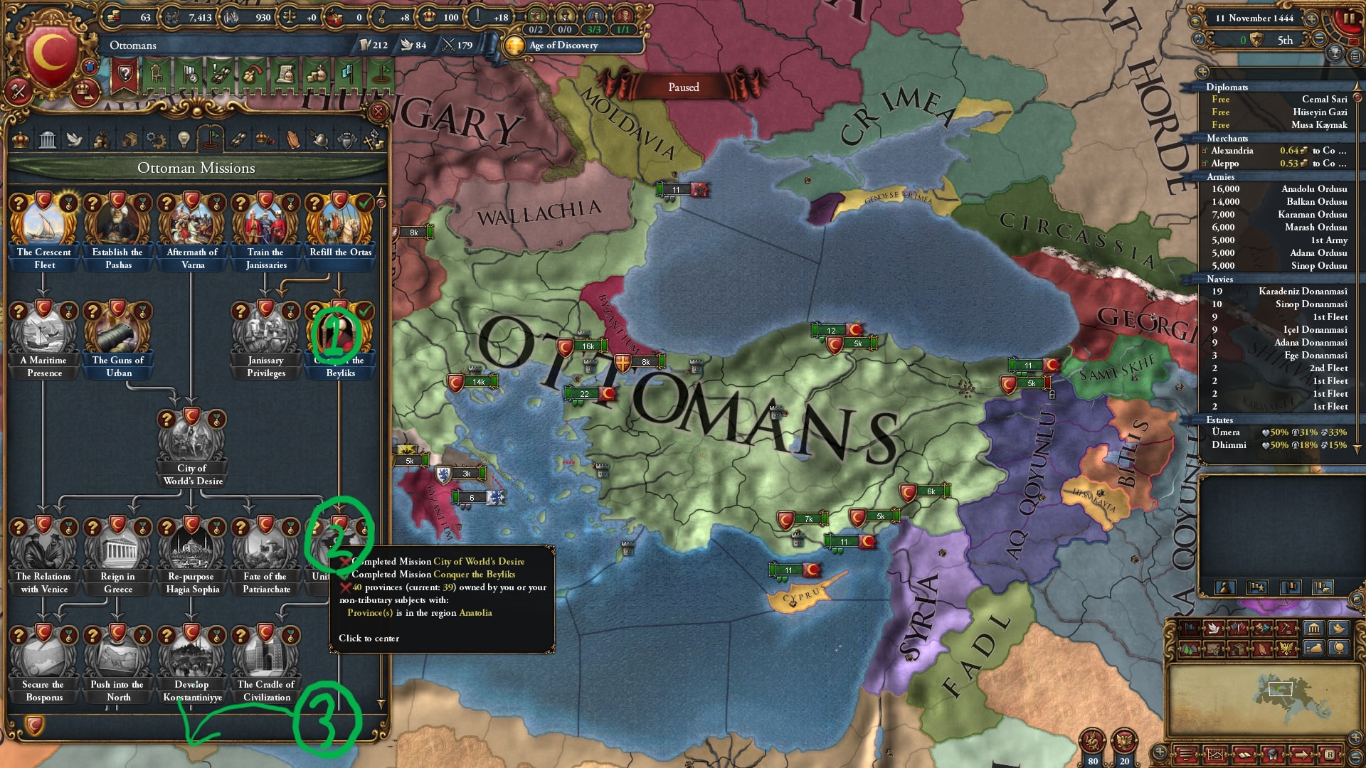 白羊朝の同盟国であるアヴァ―ルにオスマンが攻め込み、詰まりが解消してしまいました。まあ1500年までよく耐えたと考えておきましょう。オスマンはこの後黒羊朝に攻め込みミッションを達成しています。