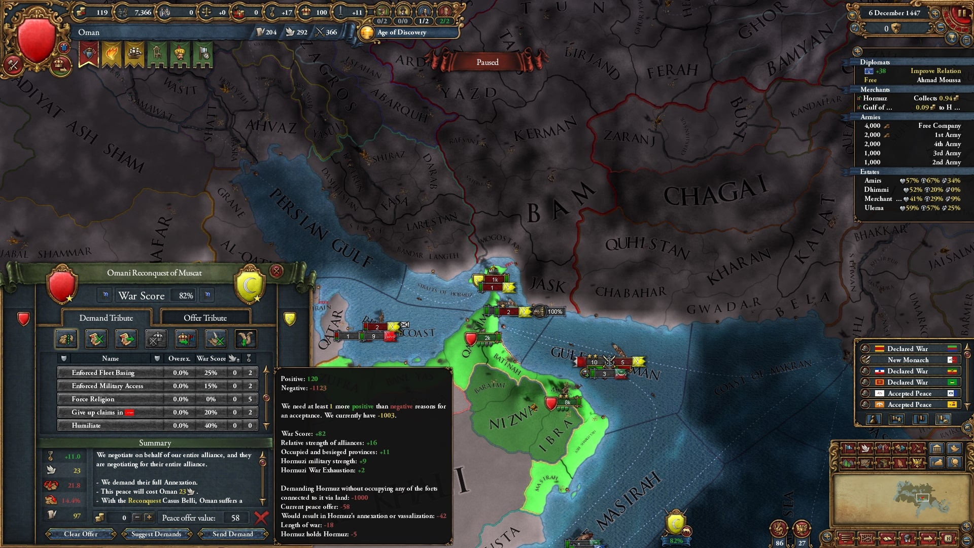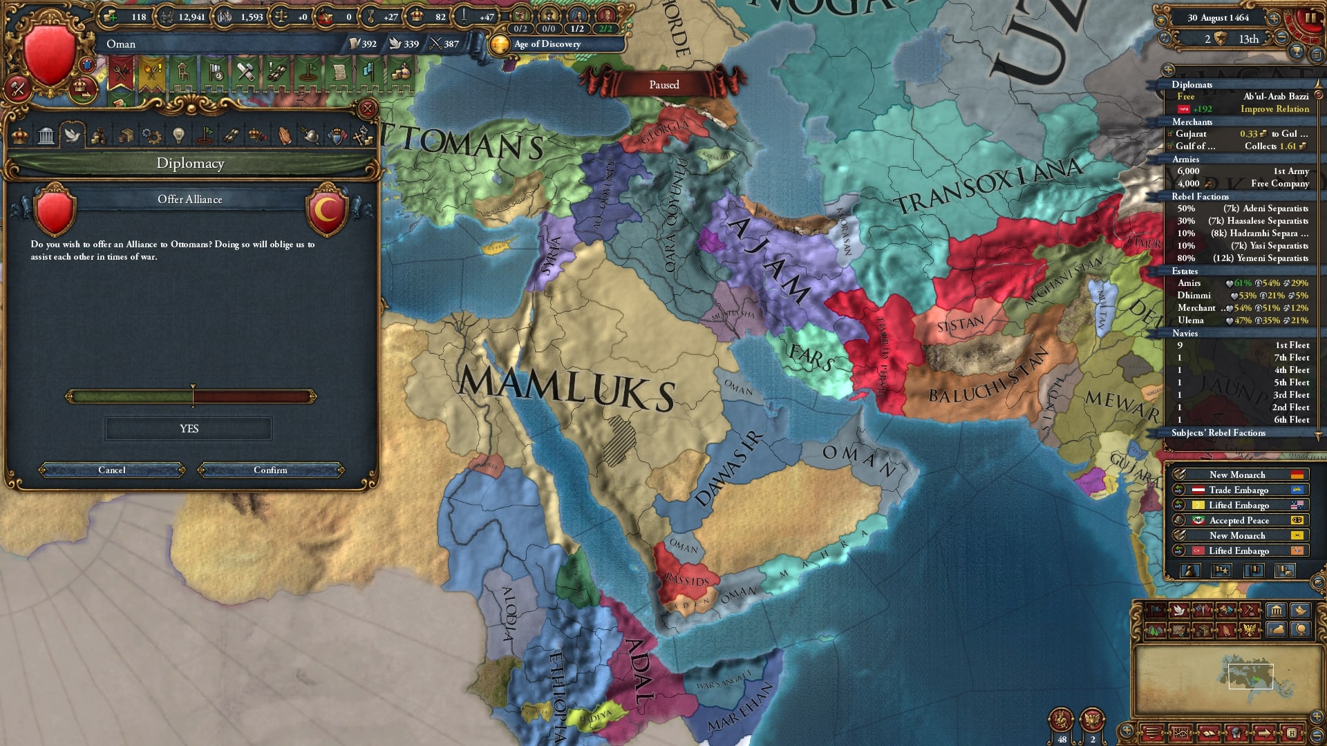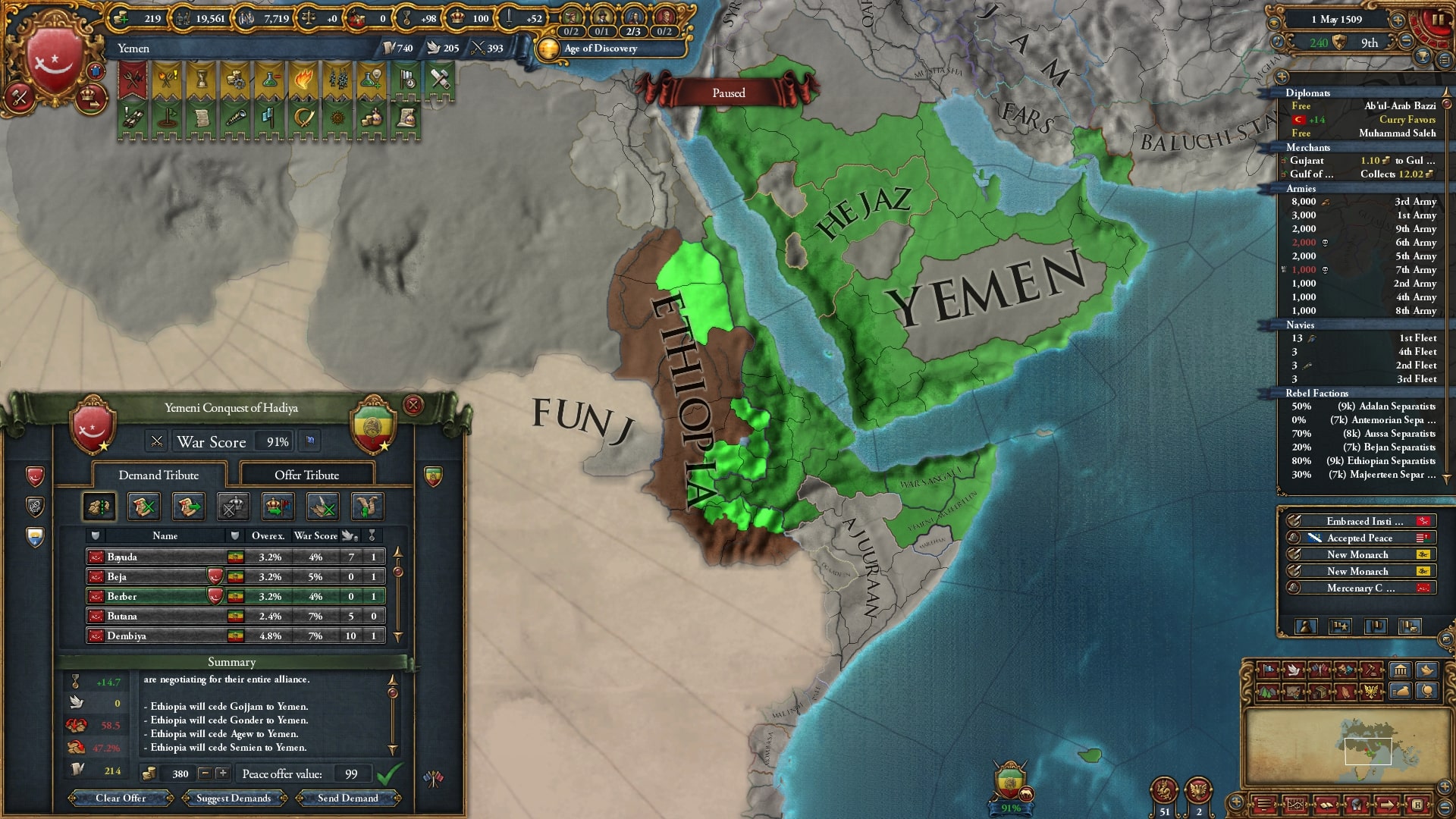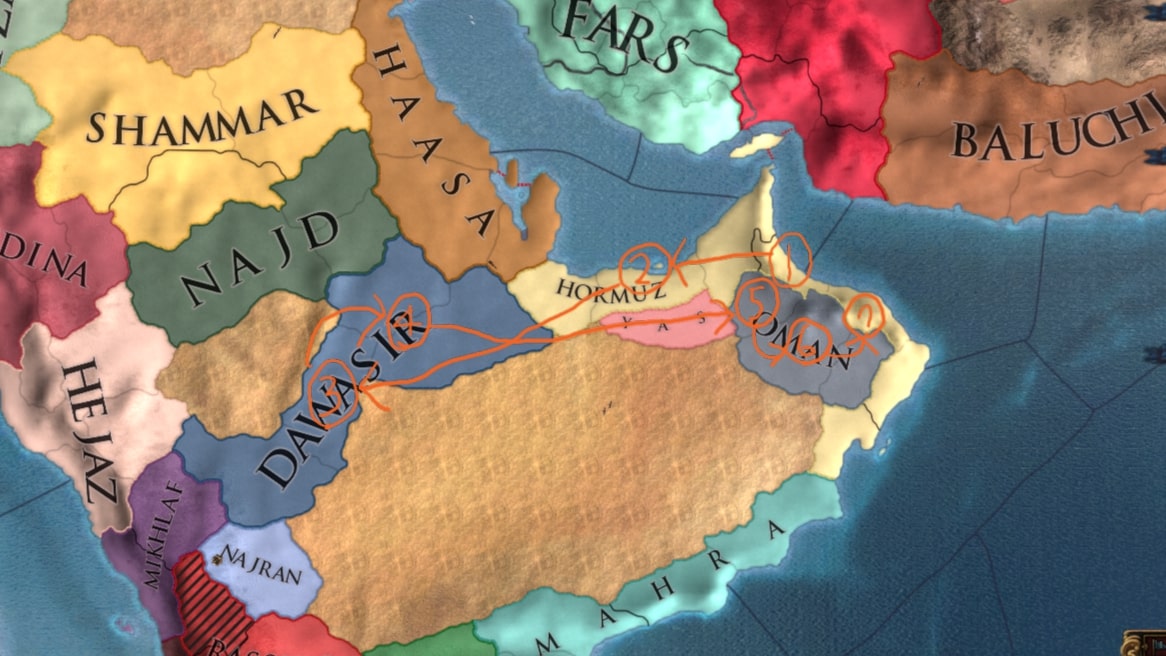 終戦後はナジュドと同盟を切りアジャム・エチオピアと同盟し、外交関係を構築します。属国化したダワーシルのCBを使ってナジュラーン→ラシード&ミフラフと戦争、ラシードを属国化したらイエメン・ハドラマウト・アデン+αが釣れました。同盟国呼べるとは言え軍量は不利ですがバラバラなので一つずつ処理します。
