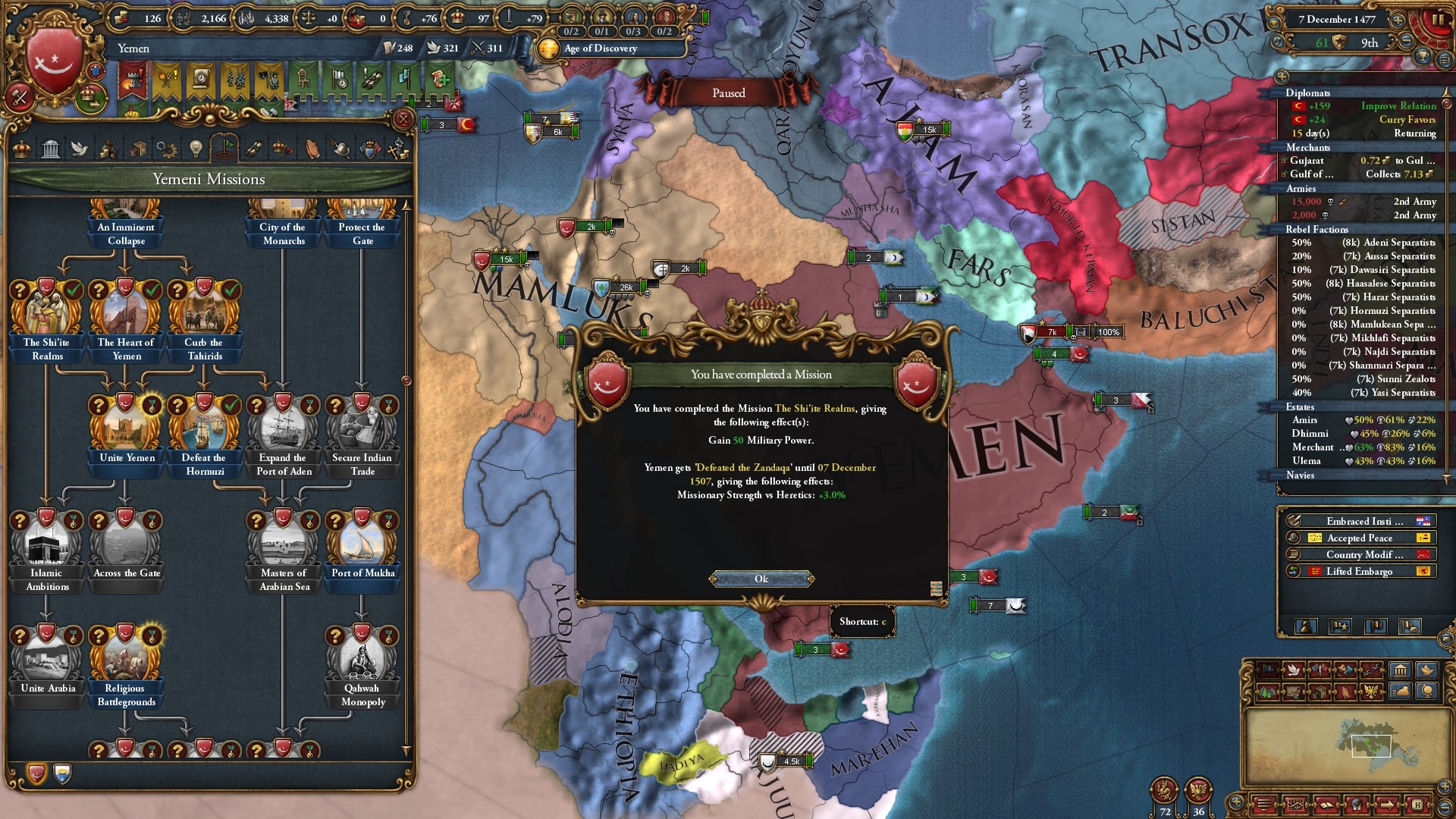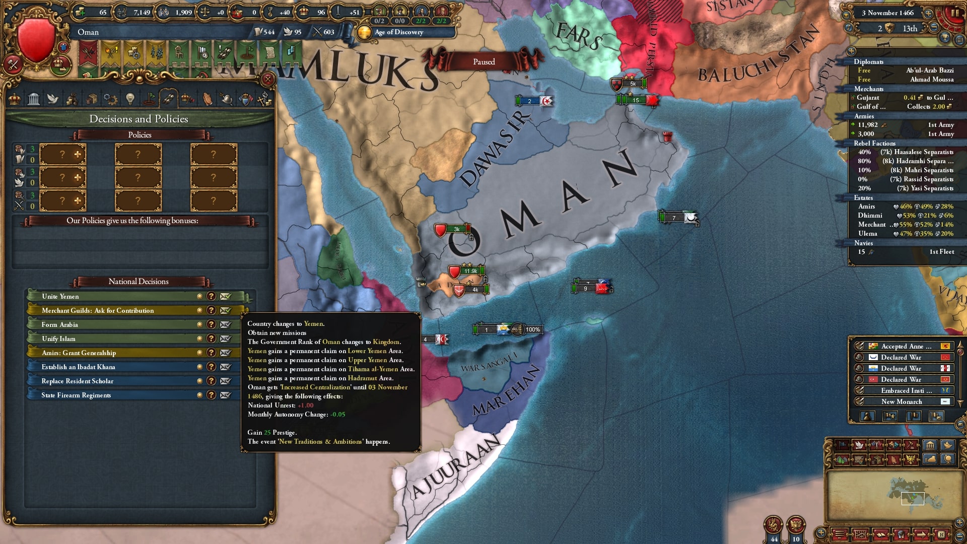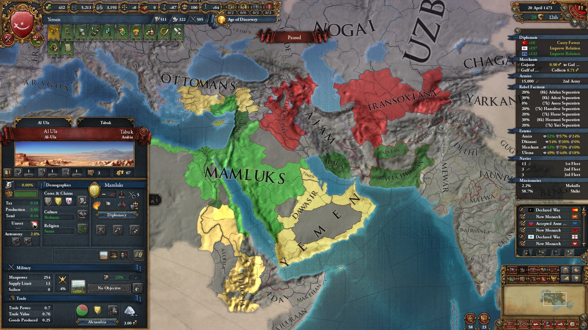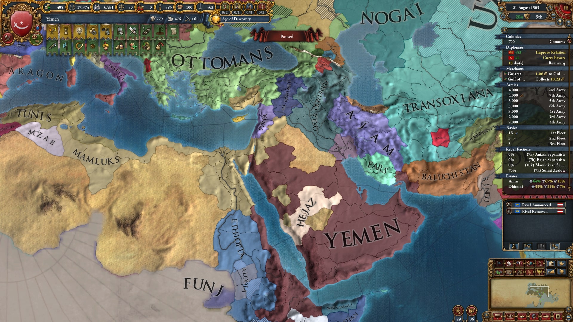1466年にラシードを併合したことによりイエメンに変態しました。領土を見てもらうとわかりますが、実は最低限確保したい土地をマムルークに取られています。イエメンのミッションが進まないので非常にイライラです。
