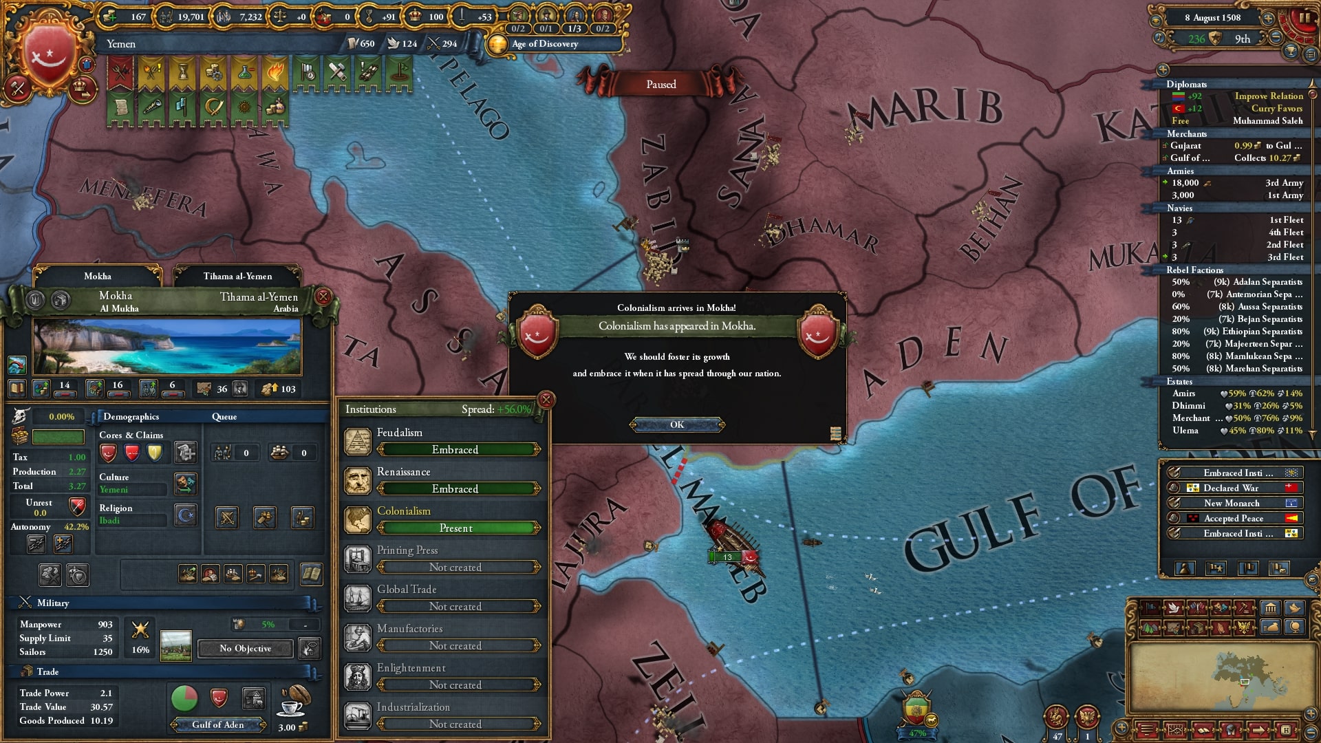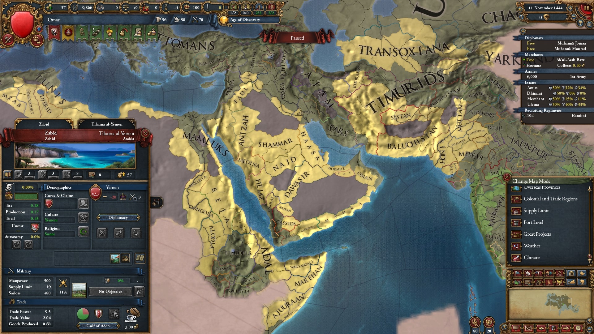 ルネサンス受容のための土地として、イエメンのZabid州を選択しました。アラビア半島は大部分が砂漠かつ乾燥気候であり計+60%(沿岸砂漠でも+45%)、とても開発に適した土地とは言えません。ただこの州は数少ない乾燥気候でない地であり、且つ海岸地形(それでも+15%)・COT持ち(アデン湾ノード)・イエメン文化州であるので、非常に開発に適した土地であると言えます。コア化直後に首都移転→開発→制度受容をしつつ、イエメン文化に主要文化を変更しました。