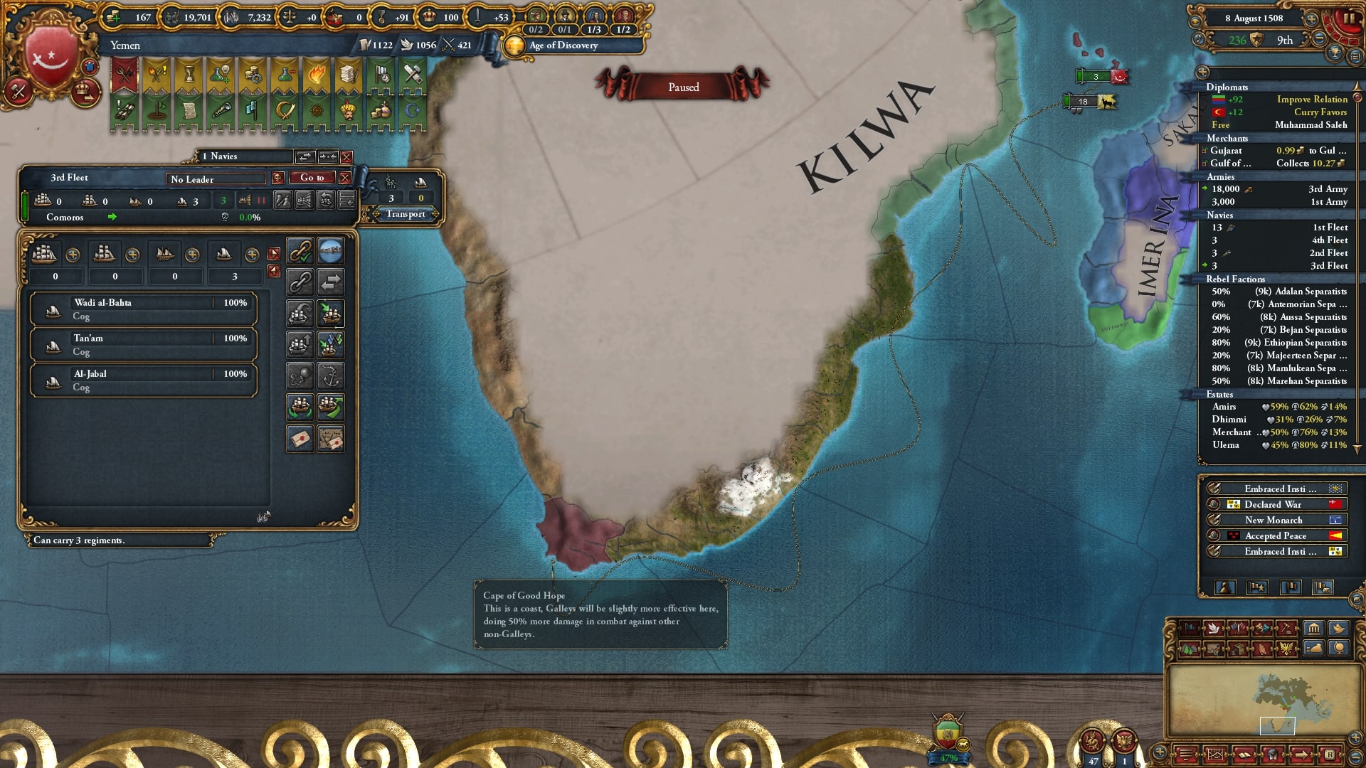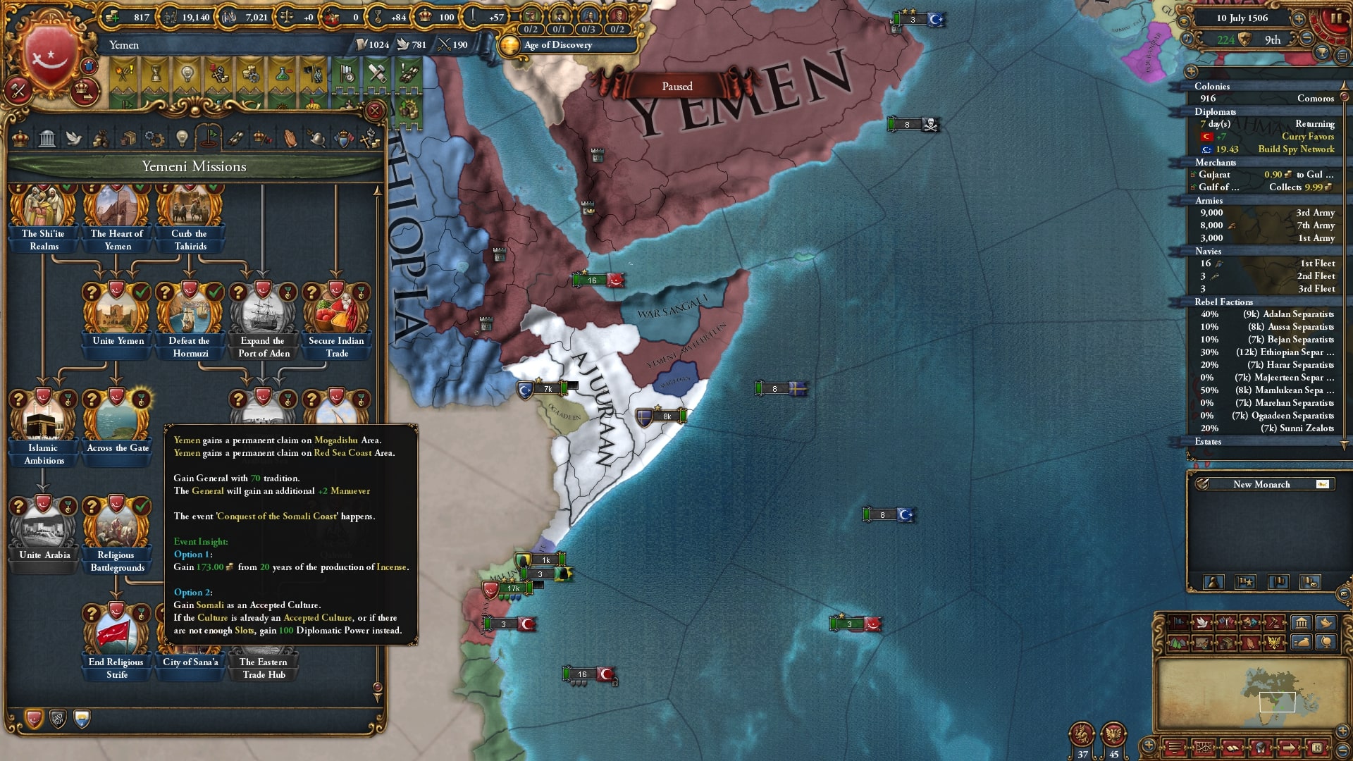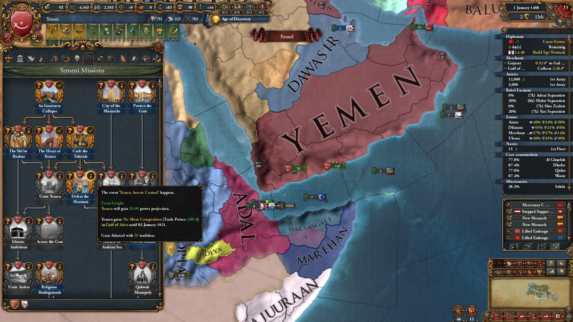 形成後にミッションを進め3-3からPP30・TP+100(アデン湾ノード、恒久)・提督を獲得。PP30もPPが減り気味な今にとってはありがたいですがやはりTP+100が大きいです。アデン湾ノードのうちアラビア半島側しか領有していないのに圧倒的な支配力をたたき出します。ザンジバルを完全確保するまではアデン湾ノードを首都ノードとして稼ぎます。