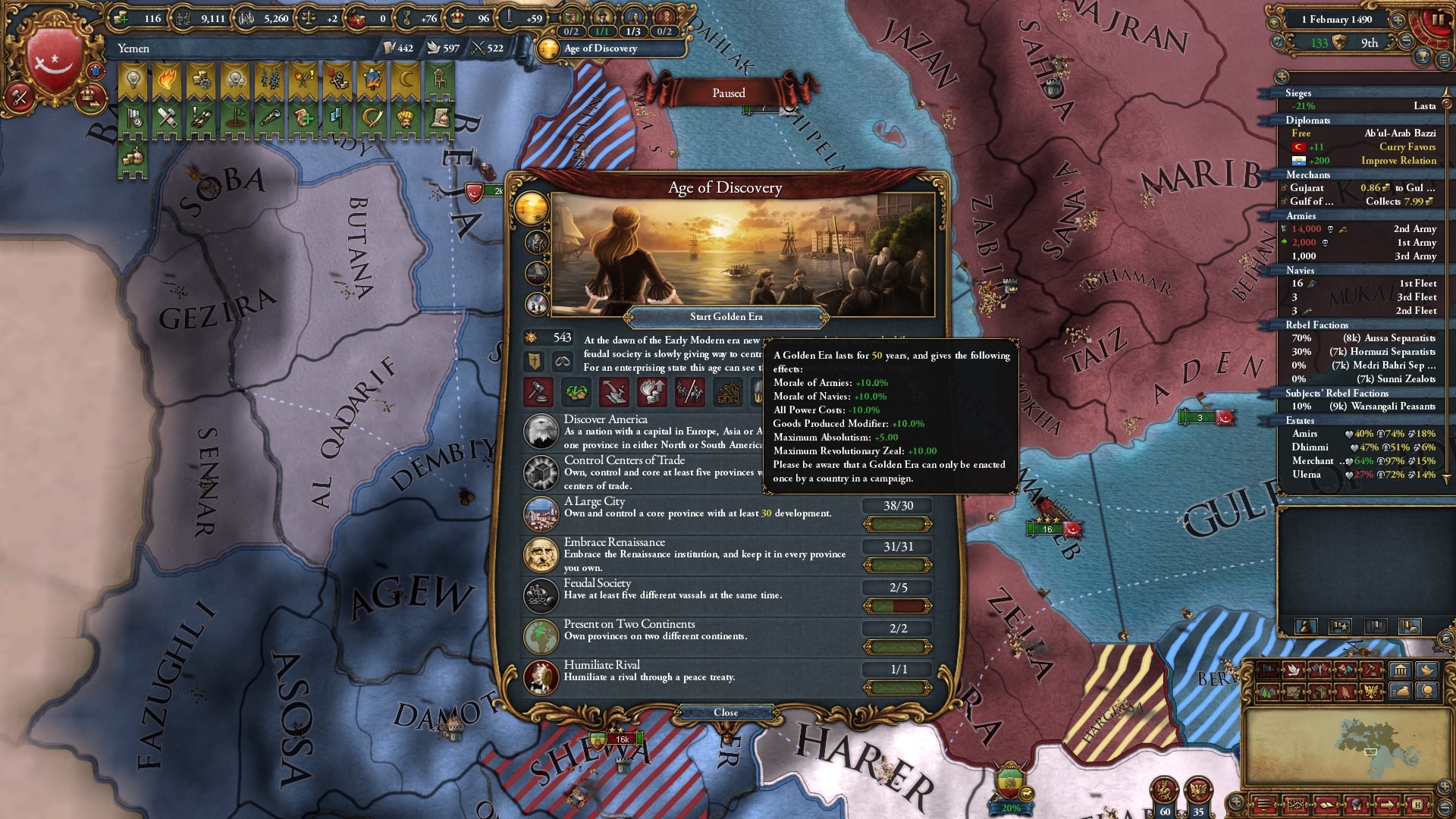 1490年、黄金時代を発動させました。今回のプレイでは基本・マムルーク・アラビアも3回で黄金時代を発動できるのでいつ発動すべきかなどは考える必要がありません。惜しみなく発動させていきます。
