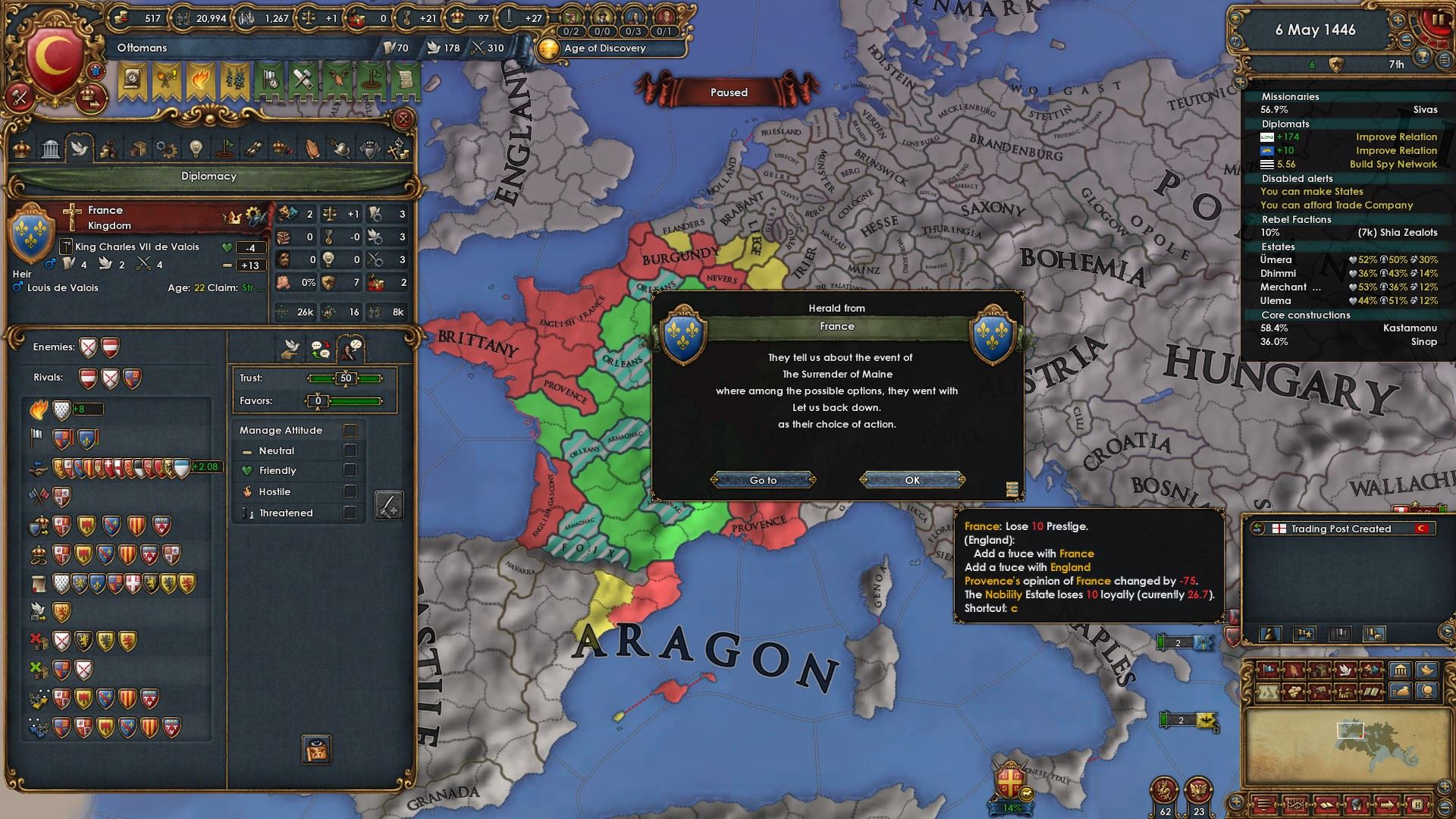 フランスと結ぶ利点は軍事力による包囲網対策、及びイベリア侵攻時のAEを低下させることが挙げられます。