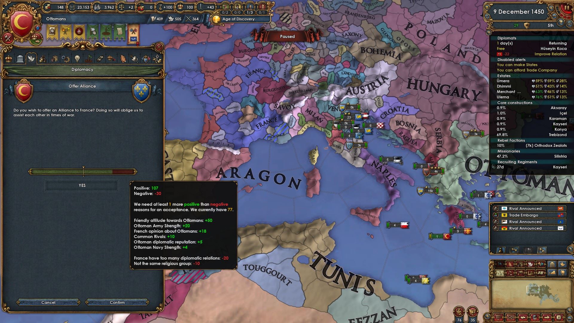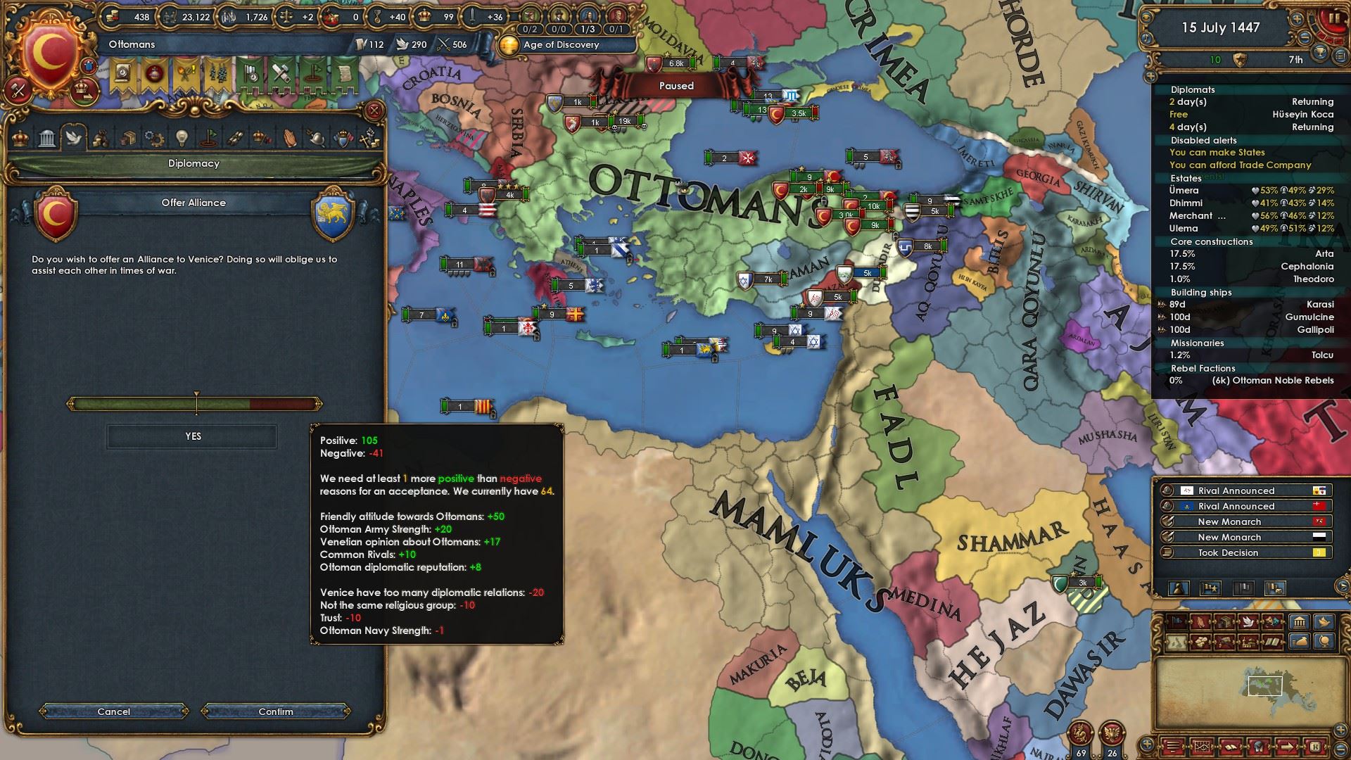 ゲーム開始時のヴェニスのオスマンに対する態度は良くないですが関係改善を続けていくと同盟が結べます。