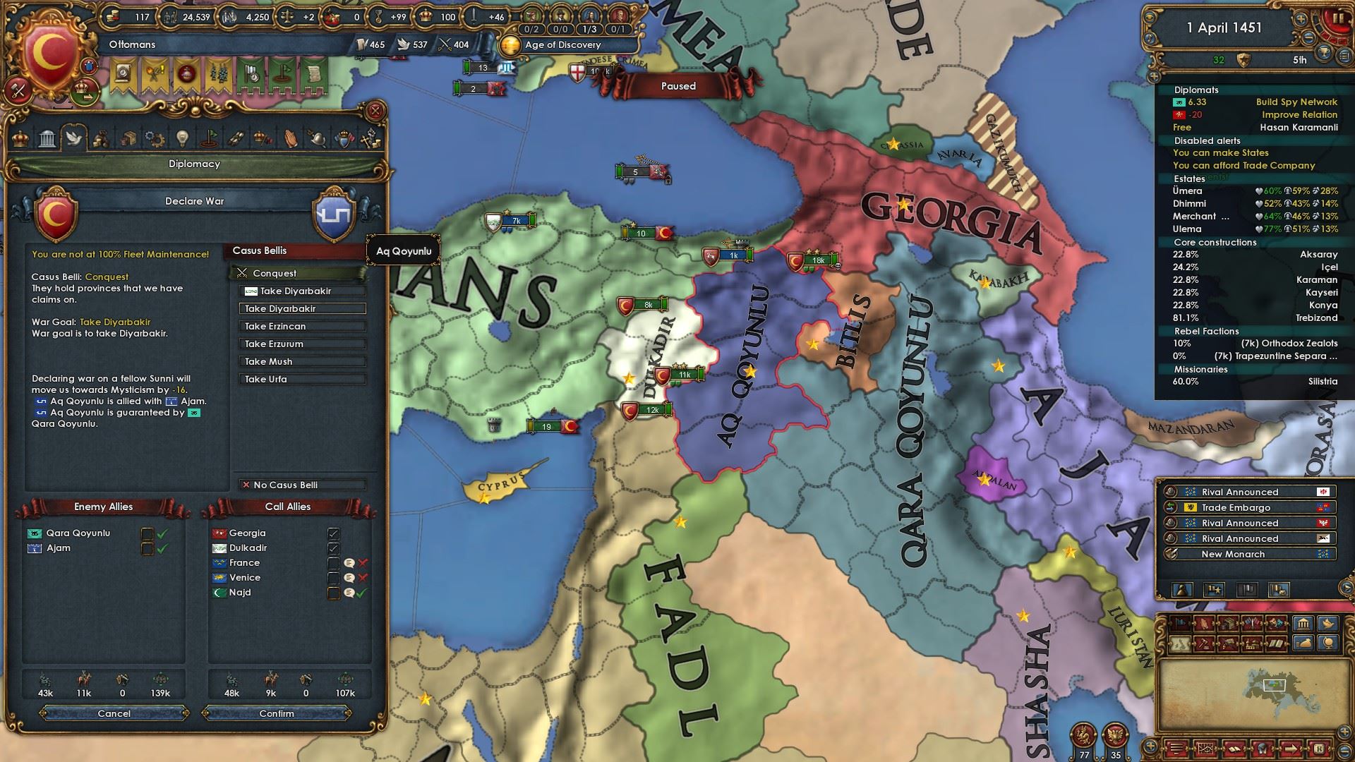 傭兵1部隊の雇用でアナトリアへの請求権が得られるミッションを達成し宣戦布告。