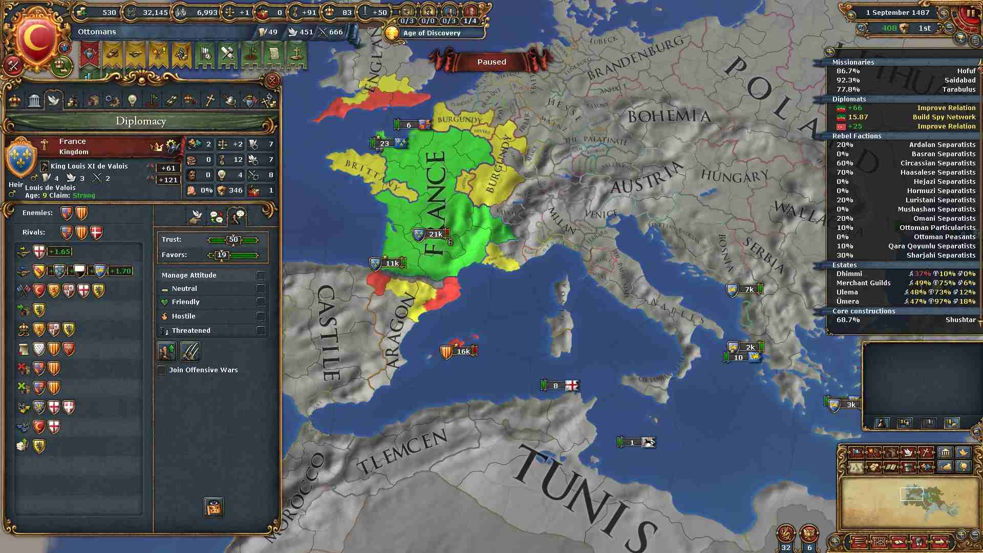 フランスとの同盟ですがオスマンの戦争中には好感度を上げる為に「攻撃的戦争への参加」にチェックを入れてますが非戦争時には外しています。