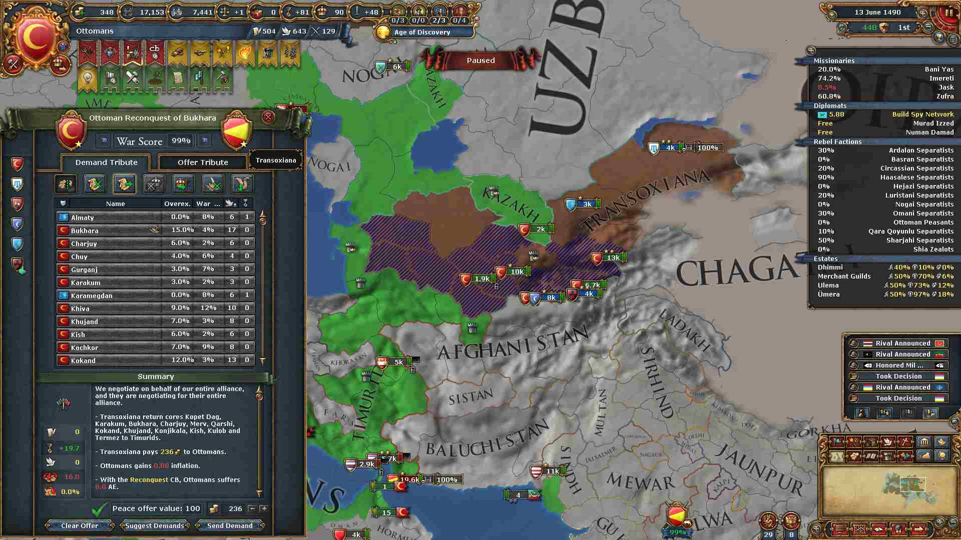 今回は戦勝点MAXで旧ティムール領及びカザフ領を返還させます。