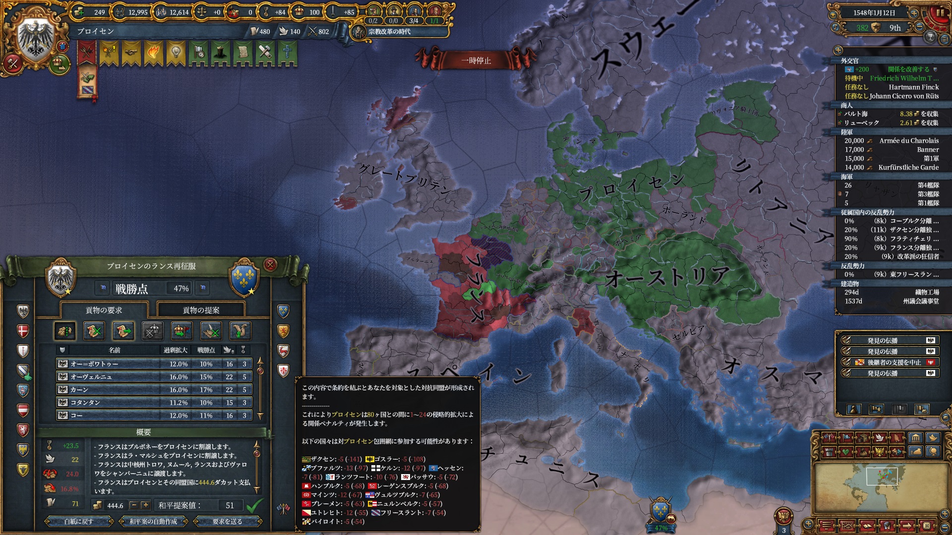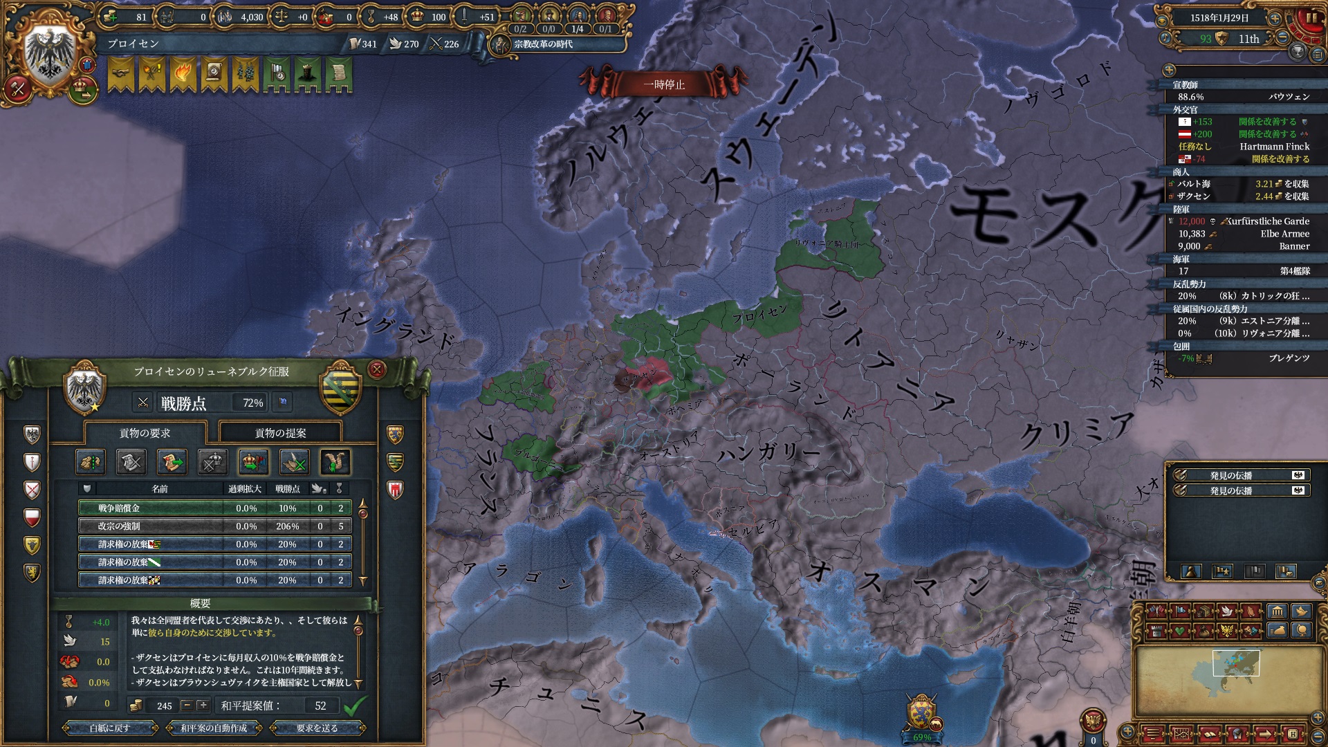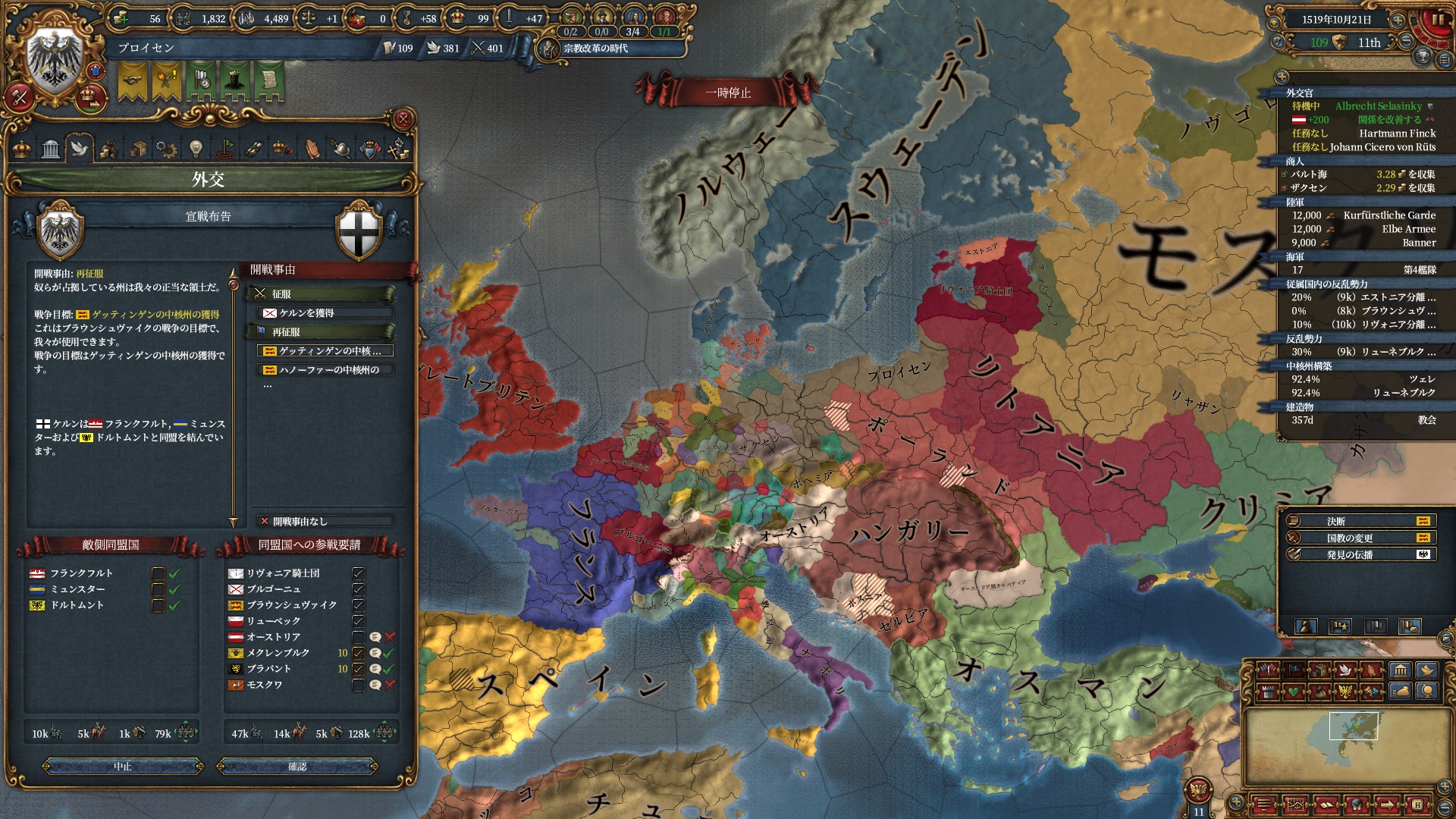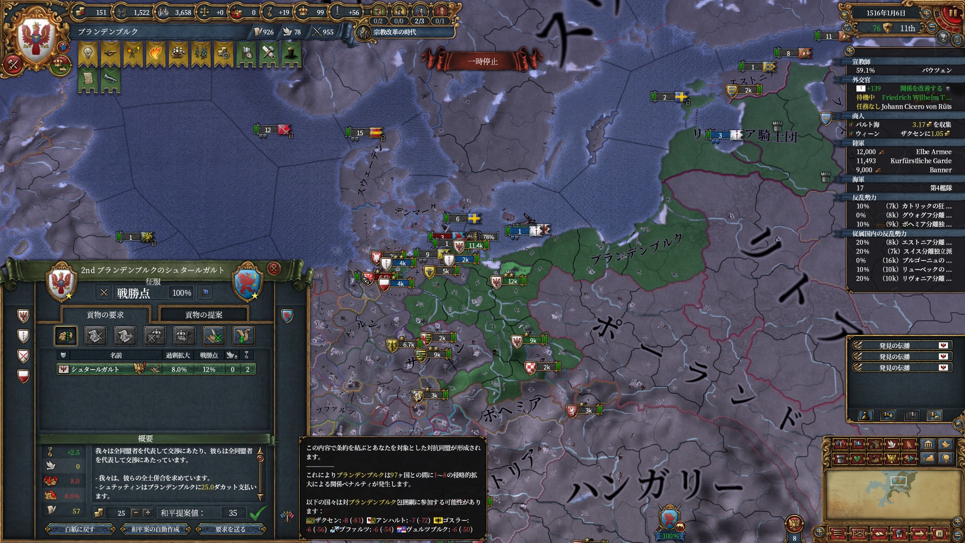 反面ブルゴーニュ継承の国力増加は大きく、ブランデンブルクdev350程に対してブルゴーニュもdev300ぐらいあるというのは中小国スタートとしてはありえないくらいのパワーアップです。