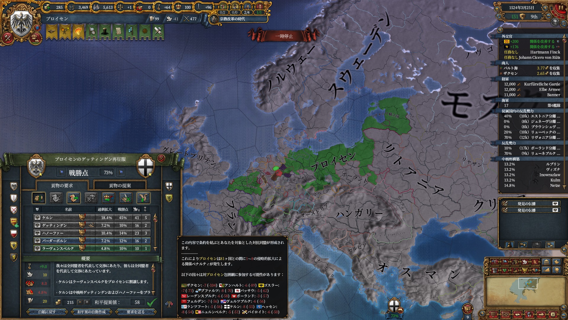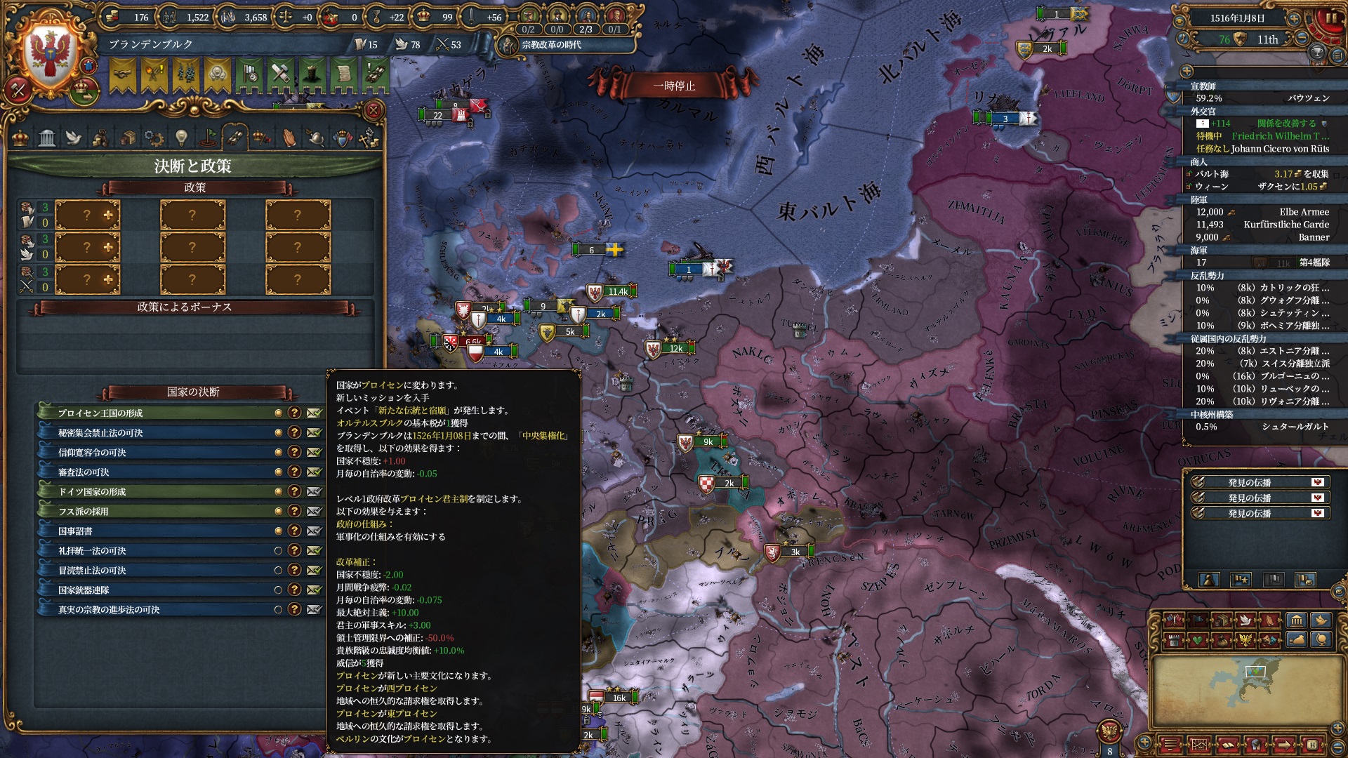 この年代のプロイセン君主制の統治キャパ-50%は果てしなく辛いですが、統治キャパ特権なり機能してるか微妙だったステートの集権化なりで凌ぎます。