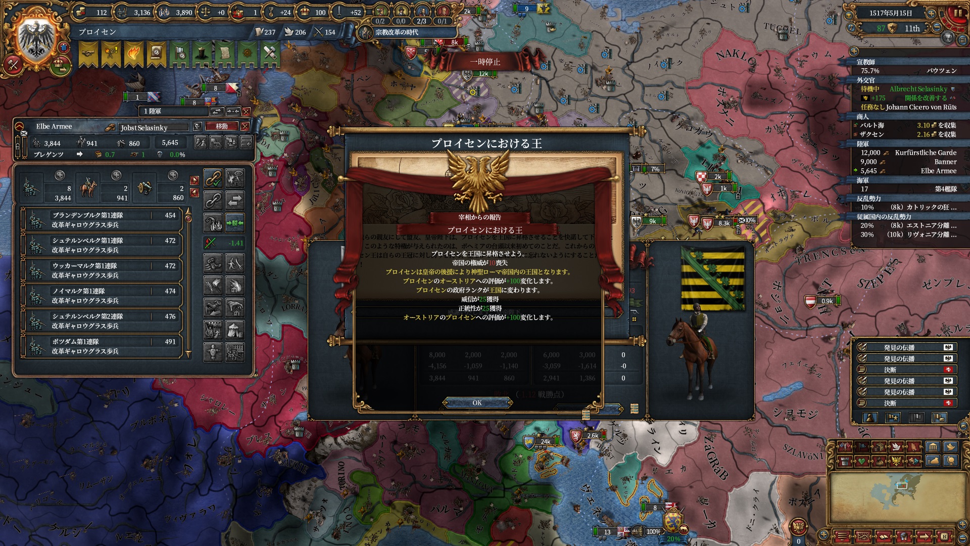 そもそもHRE選帝侯は自力で王国までは昇格出来るため自身でプロイセンを形成する頃に自然になれている事が多いです。